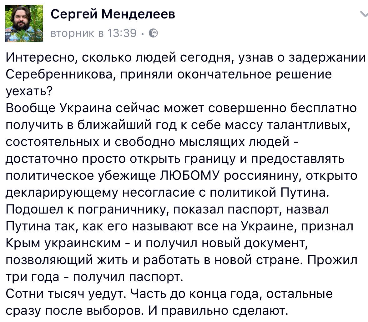 Владимир Путин, президент РФ: «Серебренников получал государственные средства — это говорит о том, что никакой цензуры или давления не было. Ему бы не давали государственных денег, если бы хотели ограничить его творческую деятельность. Вопрос со стороны следствия только в законности расходования бюджетных средств. Если вы посмотрите финансирование по линии правительства — это где-то 300 млн рублей. А по линии правительства Москвы — где-то 700 млн за два-три года». Несмотря на то, что Серебренников находится под домашним арестом, говорить о его вине можно будет лишь после решения суда, отметил президент. Владимир Путин: «Несмотря на то, что он находится под домашним арестом, это не значит, что он в чем-то виноват. Виноват он или нет, может определить только суд». http://www.ntv.ru/novosti/1924206/ | |