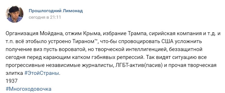 Я считаю, что высылка американских дипломатов - это не реакция на высылку наших дипломатов, как некоторые тут думают, сделанную достаточно давненько уже Обамой. Это реакция на санкции, принятые конгрессом. Трамп же их подписал неохотно. Ликбез о санкциях тут: https://navalny.com/p/5475/#cut Интересно было бы почитать ликбез не только от навальнистов, но и прокремлёвцев и выводы. А пока, если кратко, выводы таковы. Нам будут зажимать углеводородные проекты и будут зажимать наших незаконных прихватизаторов. Следовательно, нам надо сфокусироваться на развитии не только углеводородных направлений в экономике. Это если говорить об экономике, а не качестве жизни вообще, счастье. | | |