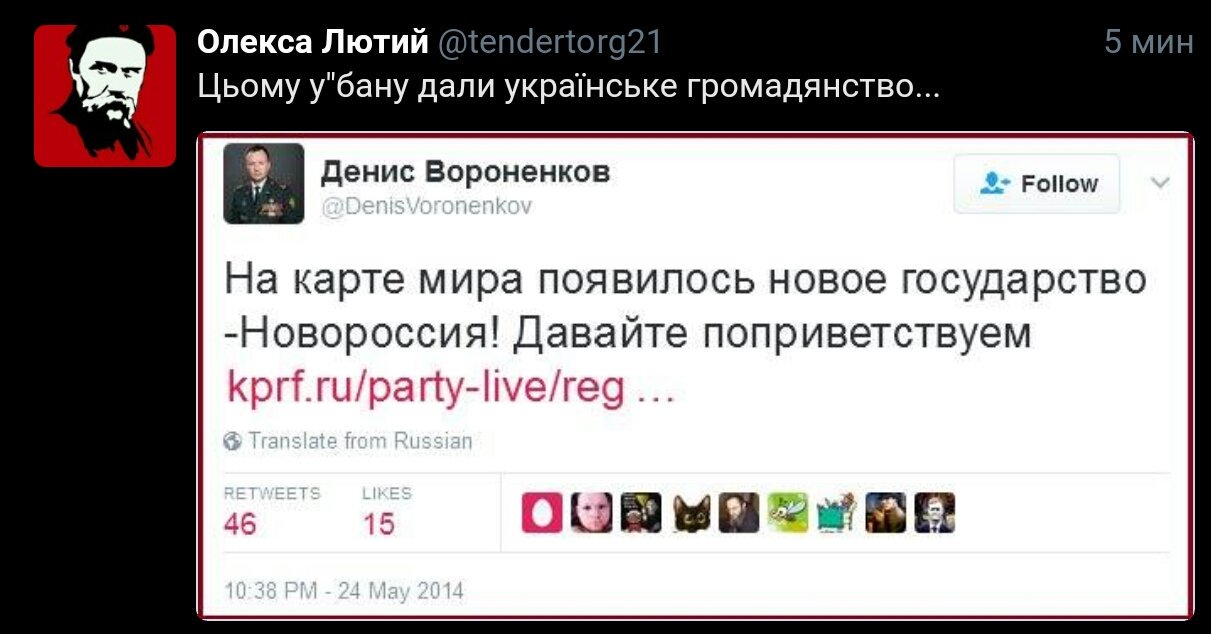 Экс-депутат Госдумы от КПРФ Денис Вороненков, объявленный в федеральный розыск по делу о мошенничестве и находящийся на территории Украины, заявил, что получал предложения работать на украинские силовые структуры. "Да", — ответил депутат в интервью телеканалу "Дождь" на вопрос о том, поступали ли ему какие-либо предложения от украинских силовых структур по поводу работы. В том числе, как сказал Вороненков, ему предлагалось работать в силовых структурах Украины в качестве "специалиста по России". При этом, какие конкретно силовые ведомства Украины предлагали работу, бывший депутат не уточнил, но признался, что пока ещё не принял предложения. https://ria.ru/world/20170219/1488315318.html | | |