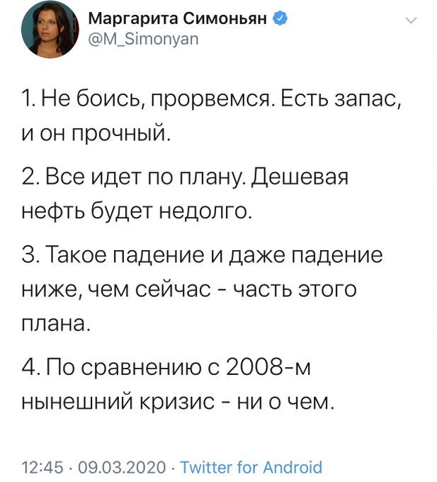 | https://www.nytimes.com/2020/03/20/w...-covid-19.html Россия готова к пандемии коронавируса лучше, чем любая страна мира. Благодаря западным санкциям Москва накопила огромные финансовые резервы, а экономика страны приспособилась к кризисным шокам, пишет 20 марта The New York Times. Издание напоминает, в 2014 году США и ЕС ограничили компаниям из РФ доступ к западным кредитам и перекрыли иностранное финансирование банковской и нефтяной отраслей. В итоге российские компании погасили свои долги перед кредиторами, что снизило и общий госдолг РФ почти на $300 млрд, а вот западные предприятия за это время наоборот набрали кредитов на триллионы долларов. Ответные шаги России подготовили ее к последующим мировым кризисам, отметили журналисты. «Далекая от краха, Россия вступает в кризис с огромными финансовыми резервами: ее крупные компании почти свободны от долгов, а сама она практически самодостаточна в плане сельского хозяйства», — говорится в статье. С учетом всего этого эксперты полагают, что по окончании пандемии Россия восстановится гораздо быстрее других стран. Также издание отметило серьезные меры, принятые российским правительством для предотвращения распространения COVID-19. РФ располагает 55 тыс. койками в больницах, имеет более 40 тыс. аппаратов искусственной вентиляции легких, ежедневно производит 100 тыс. тестов на вирус и снижает контакты людей путем карантина. В итоге в стране пока чуть более двух сотен зараженных, пока в соседних странах они исчисляются тысячами. Журналисты пришли к выводу, что «излишняя экономия» России теперь оправдывает себя. «Весь период санкций Россия наращивала свои запасы, занося в бюджет искусственно заниженную оценку мировых цен на нефть. Все налоги на прибыль выше этого уровня шли в национальную копилку. Эта политика обеспечила России устойчивость перед лицом эпидемии коронавируса», — добавило издание. ====== Бггггг | |