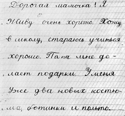 | В 1947 году Владимир Высоцкий с отцом уехал в Германию. Вот тогда он и стал писать письма матери. И почти в каждом письме есть фраза: "Мамочка, у меня всё хорошо!". И ни в одном письме нет ничего такого, что могло бы маму огорчить или расстроить. В первом письме очень трогательно пишет о том, что купил ему отец. | | |