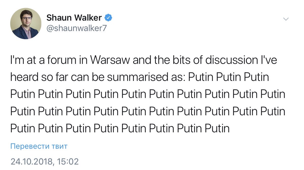 В Польше в среду и четверг 24-25 октября проходит ежегодный Варшавский форум по безопасности, в ходе которого рассматриваются такие вопросы, как глобальные изменения в НАТО, ЕС и программах Восточного партнерства, а также в сфере обороны и безопасности Однако, как отметил корреспондент The Guardian Шон Уокер, повестка мероприятия фактически превратилась в обсуждение руководства России. Он вкратце описал содержание сегодняшнего форума в Варшаве. В частности, журналист отметил, что все и вся на форуме говорили о Владимире Путине. ![]() Осв, скот, как там с извинениями Мизулиной? | | |