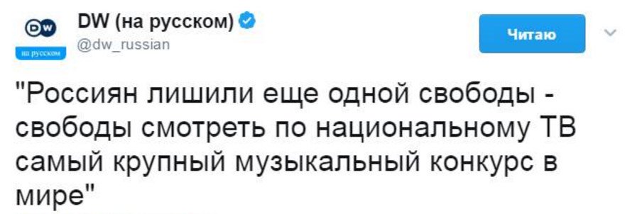 "Европейский вещательный союз рассмотрит возможность недопуска России к музыкальному конкурсу «Евровидение» в 2018 году. Вердикт будет вынесен после проведения соревнования в Киеве, сообщили организаторы события «Ленте.ру» в пятницу, 14 апреля." https://lenta.ru/news/2017/04/14/eur...a-zadumalis-ob ---- всё весельше и весельше. Надеюсь у EBС хватит смелости, а там глядишь где 2018 там 2019 и потихоньку Россия из этого толератсного лайна "Евроненавиденье" и выйдет. | | |