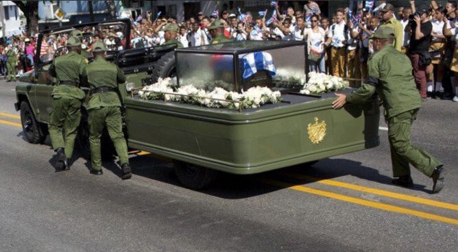 | Похороны исторического лидера Кубинской революции Фиделя Кастро завершились сегодня в Сантьяго-де-Куба. Команданте обрел последнее пристанище на кладбище Санта-Ифигения, рядом с мавзолеем национального героя страны Хосе Марти. Председатель Госсовета и Совета министров Рауль Кастро на субботнем митинге в Сантьяго-де-Куба сообщил, что похороны будут скромными. Кубинские государственные СМИ, в свою очередь, назвали церемонию "торжественной", однако отметили, что приглашен на нее будет узкий круг лиц. Начало похорон обозначил артиллерийский салют. Прямой трансляции с некрополя Санта-Ифигения не было. Представители кубинских властей ранее предупредили журналистов, что доступ на кладбище будет открыт только после того, как с Фиделем Кастро простятся его родственники и близкие. Фидель Кастро скончался 25 ноября на 91-м году жизни. С 26 ноября в стране был объявлен девятидневный траур. С 30 ноября кортеж с прахом команданте проделал путь более чем в тысячу километров по 13 из 15 провинций страны. Процессия повторила - в обратном направлении - маршрут "Каравана свободы", по которому в январе 1959 года повстанческая армия во главе с легендарным команданте совершала победное шествие после свержения диктатуры Фульхенсио Батисты. Собсно и всё.... Для кого то праздник,для кого то горе.( | | |