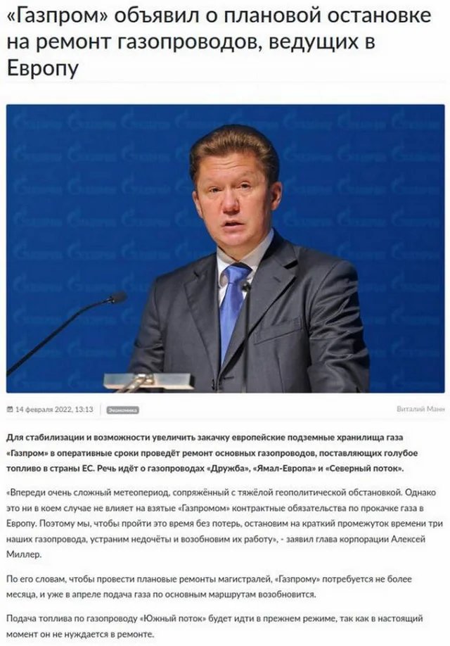 «Газпром» не стал бронировать мощности польского участка газопровода «Ямал-Европа» и дополнительную транзитную мощность через Украину на март. В ходе сессии на Regional Booking Platform остались невостребованными предлагаемые «Оператором газотранспортной системы Украины» мощности по двум маршрутам: на газоизмерительной станции (ГИС) «Суджа» было предложено 9,8 миллионов кубических метров в сутки, еще 5,2 млн «кубометров» в сутки — на ГИС «Сохрановка». В январе «Газпром» использовал только половину украинских мощностей, доступных по долгосрочному контракту — 54 миллиона кубических метров в сутки. | | |
