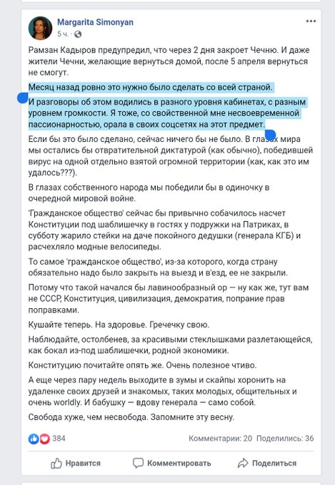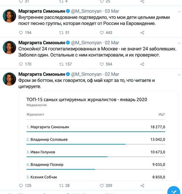| Как узнать, что Симоньян врёт? Рот открыла - значит врёт. Месяц назад она вполне безмятежно говорила, что в России всего один больной и волноваться не надо. Три недели назад она говорила, что нынешний кризис не о чем. А ещё до этого она писала,что эта зараза берет только китайцев | | |