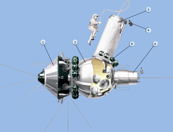 | 18 марта 1965 года впервые в мире был осуществлен выход человека в открытое космическое пространство. Его совершил летчик-космонавт СССР Алексей Леонов во время полета на космическом корабле "Восход-2" (18-19 марта 1965 года), на котором он был вторым пилотом, а Павел Беляев — командиром. Для выхода человека в открытое безвоздушное пространство на многоместном космическом корабле "Восход" была дополнительно установлена шлюзовая камера (кодовое название "Волга"), которая имела цилиндрическую конструкцию и состояла из 36 надувных секций, разделенных на три изолированных друг от друга группы. Камера сохраняла свою форму даже в случае выхода из строя двух из них. | | |||||