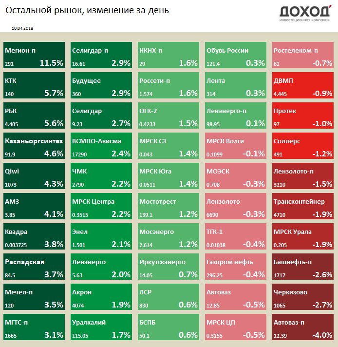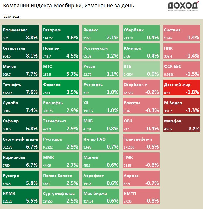 Капитализация российского фондового рынка упала за понедельник на 820 млрд руб. — с 9,835 млрд до 9,015 млрд руб. ($149 B) Лидеры падения - акции производителя алюминия Rusal (- 20%), металлургической компании «Мечел» (- 19%), принадлежащего сыну миллиардера Сулеймана Керимова золотодобытчика «Полюс» (= 16%), Сбербанка (- 17%), кредитовавшего часть попавших под санкции российских компаний, в том числе Rusal, и «Норникеля» (- 14,5%), в котором Олег Дерипаска владеет долей и чьи акции заложены по кредиту Rusal перед Сбербанком. | | |