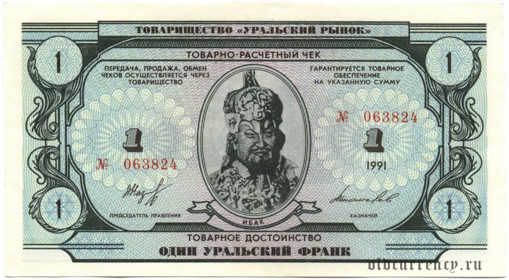 237-Хохломоскаль >ты хоть знаешь что это было?))) Ура́льские фра́нки — товарно-расчётные чеки товарищества «Уральский рынок». Были напечатаны в 1991 году по инициативе группы молодых предпринимателей и общественных деятелей под руководством уральского бизнесмена и политика Антона Бакова. Причинами выпуска банкнот были увлечение идеей частных денег под влиянием экономистов Фридриха фон Хайека и Виталия Найшуля, а также головокружение от сверхдоходов у начинающих капиталистов. Косвенно преследовалась и цель пропаганды идей Уральской республики. | | |