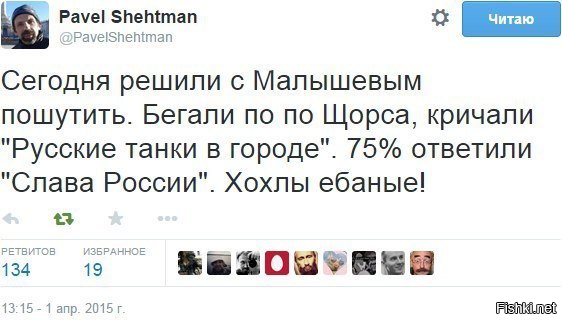 Кукла, наряженная в окровавленную вышиванку, была помещена на указательном столбе на пересечении улиц Дерибасовской и Леха Качиньского. На шею чучелу авторы инсталляции прикрепили табличку с надписью: «Порошенко Петр Алексеевич. 26.09.1966 — 2015». «Так одесситы в день юмора ответили президенту Украины на его политику в отношении граждан Украины», — заявили активисты в своем сообщении. Аналогичная акция была проведена в Одессе 15 марта, но уже с «участием» чучела украинского премьер-министра Арсения Яценюка, - отмечают обозреватели. Его кукла была вывешена на бульваре Жванецкого. На груди также помещалась табличка: «Прости, Украина, продал душу МВФ, а народ в рабство!». http://www.trud.ru/article/01-04-201...oroshenko.html | |