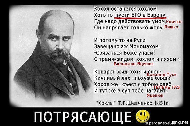 Украина имеет самые богатые в мире чернозёмы. Украину не трясёт, как Японию. На её территории нет пустынь, как в Монголии. Ей не палит солнце, как Африку. Её не засыпает снег, как Россию. На её территории нет вулканов, как в Исландии. Она имеет выход к морю, в отличие от Белоруссии. Она имеет запасы питьевой воды, в отличие от Израиля. Она имеет залежи полезных ископаемых в отличие от Германии, Японии, Сингапура, Гонконга. Она имеет выгодное географическое положение, в отличие от Норвегии или Монголии. Она имеет хороший умеренный климат, в отличие от Финляндии или Нигерии. Она имеет огромную (в сравнении с европейскими странами) территорию. Она имеет терпеливый и трудолюбивый народ. Я расположил её рядом с дружественными, братскими народами, один из которых имеет мировое влияние. Что же я ещё не дал этой стране? Почему она всем завидует? Почему всегда ищет виновных в своих проблемах? Почему умудрилась рассориться с родными братьями? Почему она так настойчиво лезет в лапы к дьяволу? Не понимаю, развёл руками Всевышний. Видимо кое-чего я им всё-таки не дал. МОЗГОВ! СТЫДА и СОВЕСТИ! | |