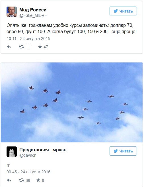 Заявление украинского правительства о том, что падение рубля стало "салютом" в честь Дня независимости Украины у экономистов вызывает только улыбки. А заявление его лидера Порошенко о том, что Украина якобы "справилась с экономическим кризисом, вызванным военными действиями в Донбассе, и в ближайшие месяцы экономический рост возобновится" блогеры сразу растащили на демотиваторы. Не оставил без внимания заявления президента Украины и официальный представитель СК России Владимир Маркин. "Когда слушаешь и тем более смотришь на этого человека, невольно вспоминается анекдот: - Папа, я хочу хлебушка. - Сынок, я тоже хочу хлебушка, но денег у нас только на водку", - прокомментировал Маркин в своем Twitter заявления Порошенко. Буквально несколько дней назад Маркин высмеял заявление Порошенко о том, что "украинский народ не является братским для российского и движется в Европу". "Украинское руководство давно уже находится в глубокой ... и активно заманивает туда весь свой народ", - указал более точное направление Владимир Маркин. К слову Порошенко уже не в первый раз становиться героем анекдота. Авторству Владимира Маркина приписывается такой: "СБУ Украины собирает информацию на крестителя Руси. Цель - выяснить, почему он крестил Русь, а не Украину". http://www.kp.ru/daily/26423.5/3296488/ | |