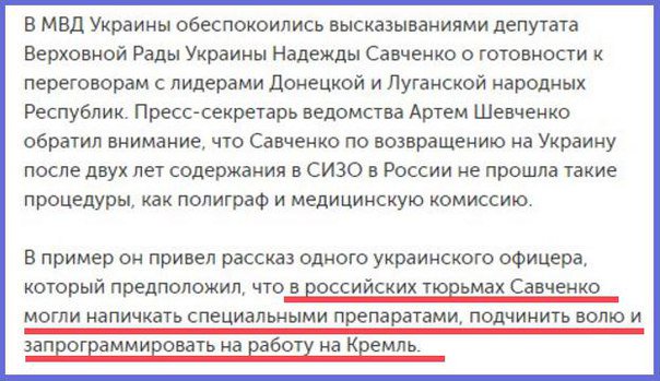 Ага, нашел. "Депутат Верховной Рады от "Батькивщины" Надежда Савченко обсудила с Президентом Украины Петром Порошенко вопрос освобождения украинских заложников в РФ и на Донбассе, а также свое участие в сессии Парламентской ассамблеи Совета Европы (ПАСЕ)" | |