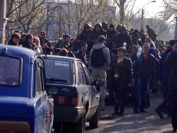 | Несколько фотографий из Краматорска.. . ![]() . ![]() . ![]() . из комментариев к фото "..60 чел. с оружием на 8 БМП.. район крытого рынка... Люди мирно общаются с военными .. заблокировали им движение. Это десантура из Днепропетровска" (c) . Взято отсюда https://twitter.com/ihotinews . Там-же опубликован снимок и шуточный снимок "а в это время где-то под Славянском" ![]() | |