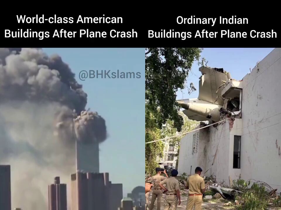 Слева: Боинг с полными баками врезается в первоклассный американский небоскрёб. Справа: Боинг с полными баками падает на общежитие в Индии, построенное хрен знает как по индийским стандартам качества из коровьих лепёшек глины и кирпичей. Вот как так-то? | |