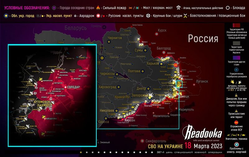 Возглавляющий ЧВК «Вагнер» Евгений Пригожин опубликовал обращение к министру обороны генералу Сергею Шойгу. Обращение связано с положением дел в Артёмовске (Бахмуте). Пригожин подтверждает информацию о том, что бойцы «Вагнеру» к настоящему моменту контролируют около 70 процентов территории города. При этом получена информация о том, что командование ВСУ готовит контрнаступление с попыткой отбить потерянные ранее территории и разблокировать свой гарнизон в Бахмуте. Евгений Пригожин: По имеющейся информации противник в конце марта-начале апреля планирует начать широкомасштабное наступление и нанести фланговые рассекающие удары с целью отрезать подразделения ЧВК «Вагнер» от основных сил ВС РФ. В связи с этим куратор «Вагнера» призывает министра обороны принять все необходимые меры для того, что предотвратить такое отсечение. В противном случае, как отмечает Евгений Пригожин, ситуация станет негативной для всей СВО. У письма есть закрытое приложение, в котором, как пишет Пригожин, раскрывается замысел противника и методы противодействия воплощению этого замысла. | | |