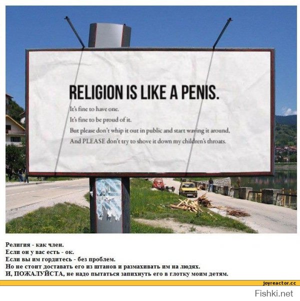 | Два священника устанавливают на дороге щит с надписью: "Остановись, конец уже близок! ! Поверни, пока не поздно! ". Мимо них на огромной скорости проезжает фура, водитель кричит и машет кулаком: — Проклятые сектанты, достали вы уже! Машина скрывается за поворотом, оттуда слышен грохот и громкий бульк. Один священник говорит другому: — Похоже, ты был прав, надо было написать просто "Мост разрушен". | |