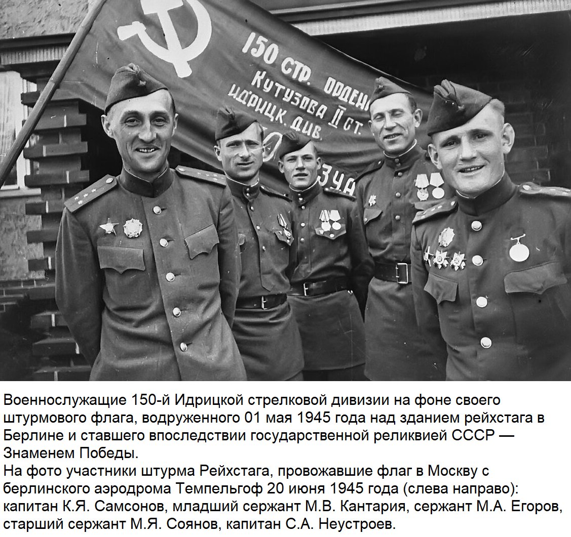 | . Группа сводного полка 1-го Украинского фронта на Параде Победы. 1-й слева — трижды Герой СССР летчик-истребитель полковник А.И.Покрышкин, 2-й слева — дважды Герой Советского Союза летчик-истребитель майор Д.Б.Глинка. 3-й слева — Герой Советского Союза гвардии майор И.П.Славянский | |