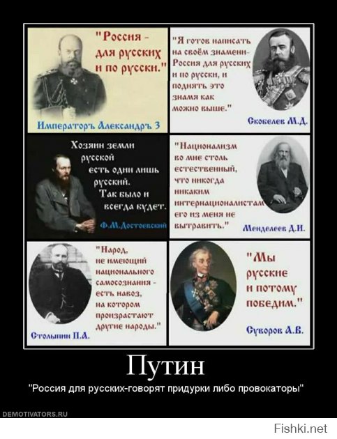 Идеология России давно сформулированна Два чувства дивно близки нам - В них обретает сердце пищу - Любовь к родному пепелищу, Любовь к отеческим гробам. На них основано от века, По воле Бога Самого, Самостоянье человека, Залог величия его. Животворящие святыни! Земля была б без них мертва, Без них наш отчий край - пустыня Душа - алтарь без божества. Пушкин | |