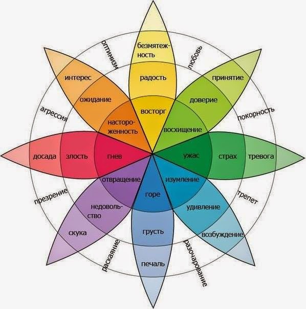 | ![]() Выдающийся американский профессор психологии Роберт Плутчик в 1980 году обозначил 8 основных эмоций и связанные с ними более сложные эмоции. Получилось наглядное «колесо эмоций». Основными эмоциями, согласно Р. Плутчику, являются радость, грусть, страх, доверие, ожидание, удивление, злость, неудовольствие. | |