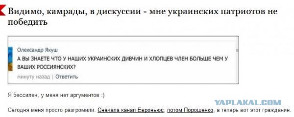 | Звонок Меркель Обаме: - Барак у меня две новости, хорошая и плохая.. - Начинай с хорошей. - Крым, опять в составе Украины! - Yessss!!!, а вторая новость?...... - Украина вошла в состав Российской Федерации! - Fuck!, а как же Майдан? - А Майдан переезжает в Вашингтон. Да и готовь Аляску... | | |