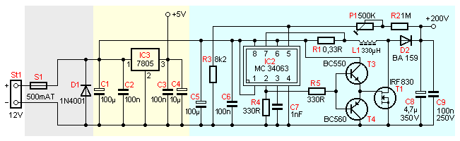 еще лучше взять 12 вольт и преобразовать их в 200 вольт с помощью двухтактного преобразователя, автогенератора на кольце диаметром 25-30 мм. Стабилизировать нет необходимости. А в этом преобразователе мощность крайне мала так как он обратноходовой и повышает с 5 вольт. Можно конечно сделать однатактный прямохожовый из него. Намотать вторичную обмотку с коэфф трансформации 40, то есть намотать в 40 раз больше витков чем в первичной. Включить в той же фазе, что бы при открытии транзистора подавался плюс на диод выпрямительный. Должно получиться неплохо. | |