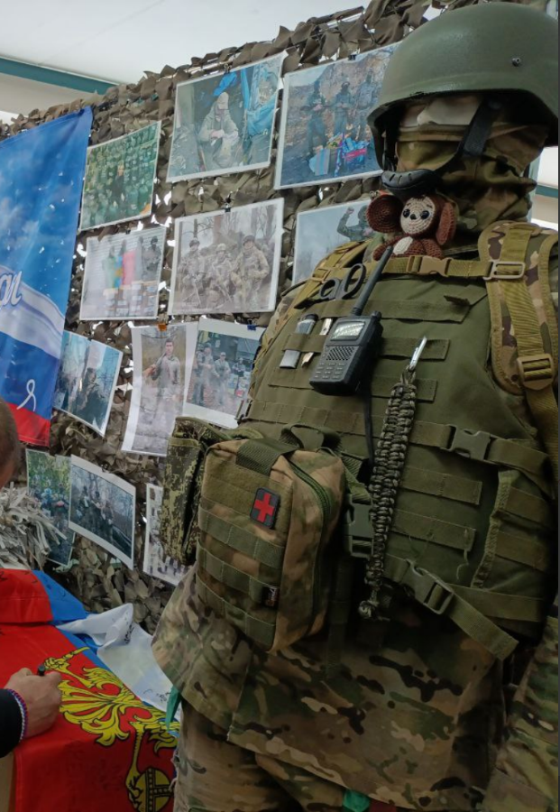 | ![]() В музее Узелков. Воин в отпуске автограф оставляет на флаге. Чебурашка на манекене бойца. На груди ремешок выживальщика, это веревочка 5 метров длинной заплетается змейкой, и на карабине пристегивается. Можно быстро её расплести, сняв с карабина. Мне такой ремешок тоже подарили года два назад, я его в походы беру с собой, он и как оберег. В ремешки же с теплом рук еще какие-то энергии вкладываются из глубин души. Еще на запястье плетут такие ремешки выживальщика с застежками. | | |