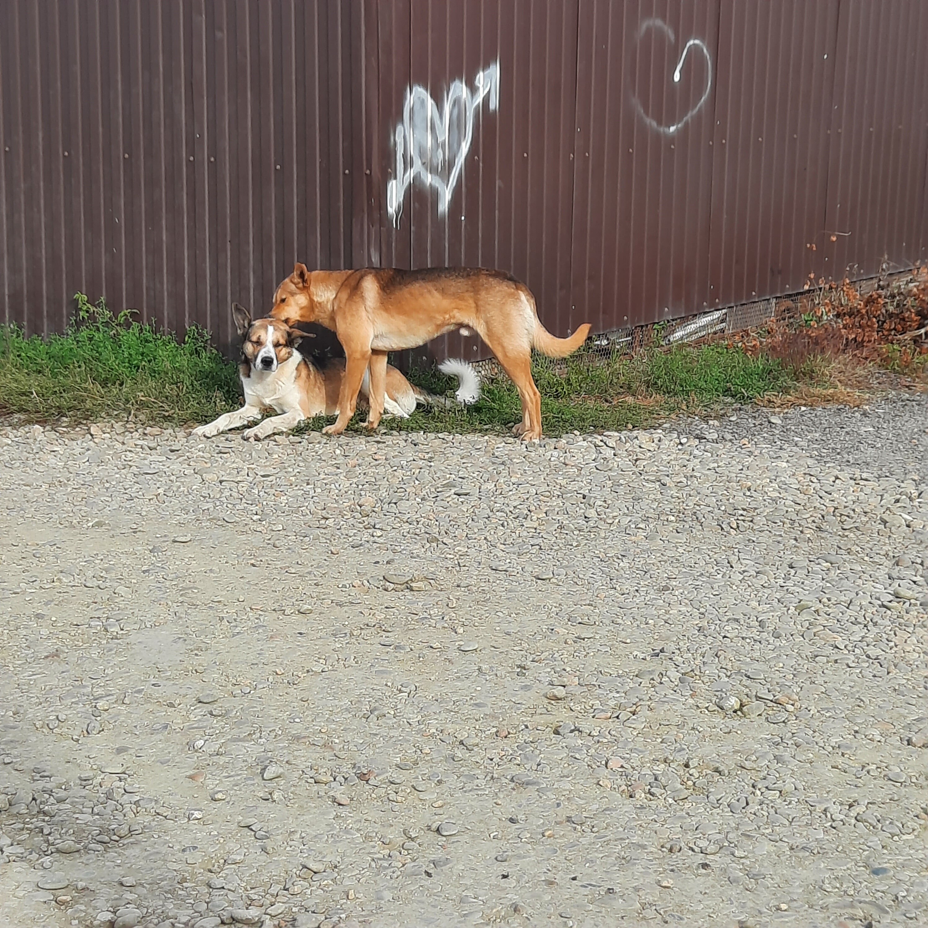 285-Я местный >286-plot >))) Я пропустила ещё интересней кадр, когда четыре собачьи мордочки вдруг высунулись из-за забора вертикально одна над другой. Но смотрели они не на меня, а на самку, которая за моей спиной была. И все они улыбались от любви к этой сучке. Я быстро начала рыться в сумке в поисках телефона, чтобы сфоткать, но упустила момент. Но здесь тоже любовная сценка, они прям глаза прикрыли от блаженства:) | |