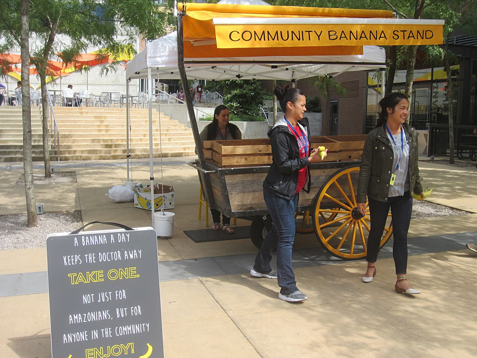 Настало время офигительных историй(с) ************************************* По будням в центре кампуса Амазона в Сиэтле стоит Community Banana Stand: Любой желающий может подойти и попросить у банисты бесплатный банан. В том районе нередко можно встретить людей, идущих с бананом по своим делам. Амазон гордится, что раздает по 8000 бесплатных бананов ежедневно - 1,7 млн бананов за всё время. | | |