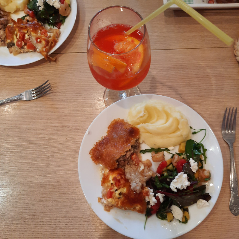Доброе утро! Прохладно с утреца. А на даче по утрам вообще холодно. Это меня алкоголь с ног свалил вчера. Там конечно не вишня была, а розовое шампанское, ликёр и апельсин. Коктэйль, короче. И с утра голова немного поболела, намёк, чтобы я больше не пила алкоголь. А в тарелке салат, который я попробовала первый раз в жизни и мясные деликатесы. И без пюре не обходится ни одно блюдо, у нас так по крайней мере.) А, еще сладкое было. Кексы с крэмом и смородиной. А у меня после дачи всегда желудок уменьшается, так я еле запихала всю эту вкуснятину. | |