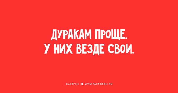 Ребенку очень трудно вести себя прилично, если он никогда не видел, как это делается. *** "Тяжело в учении? Легко в бою!" - поприветствовал военком отчисленных за неуспеваемость студентов. *** Хочется быстрей разбогатеть и всем говорить, что деньги не главное. *** Дружбу не предлагать! Только замуж! *** Я все жду, когда в толерантной и эмансипированной Европе начнут сажать за изнасилование резиновых женщин. | |