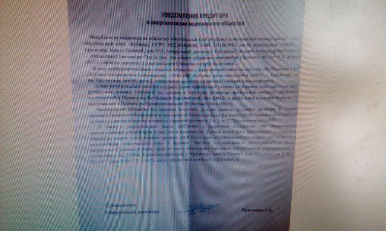 Крапивка направил футболистам и кредиторам "уведомление о реорганизации акционерного общества" за своей подписью . В тексте целью замены НАО на ООО указано "создание более эффективной системы управления футбольным клубом". По факту - уход от долгов. В конце уведомления Крапивка предлагает кредиторам и футболистам возмещать убытки или компенсации и потери в судебном порядке. ![]() | | ||