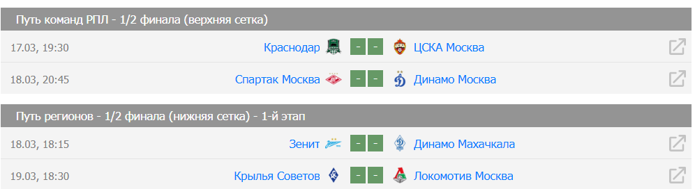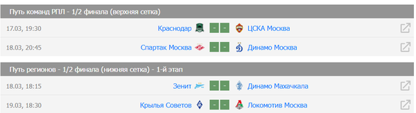 | 17 марта предстоит сыграть: Крылья Советов - Мастер-Сатурн (Ж); Зенит - Динамо, Махачкала; Краснодар - ЦСКА ; 18 марта играют: Спартак - Динамо (Москва). | |
