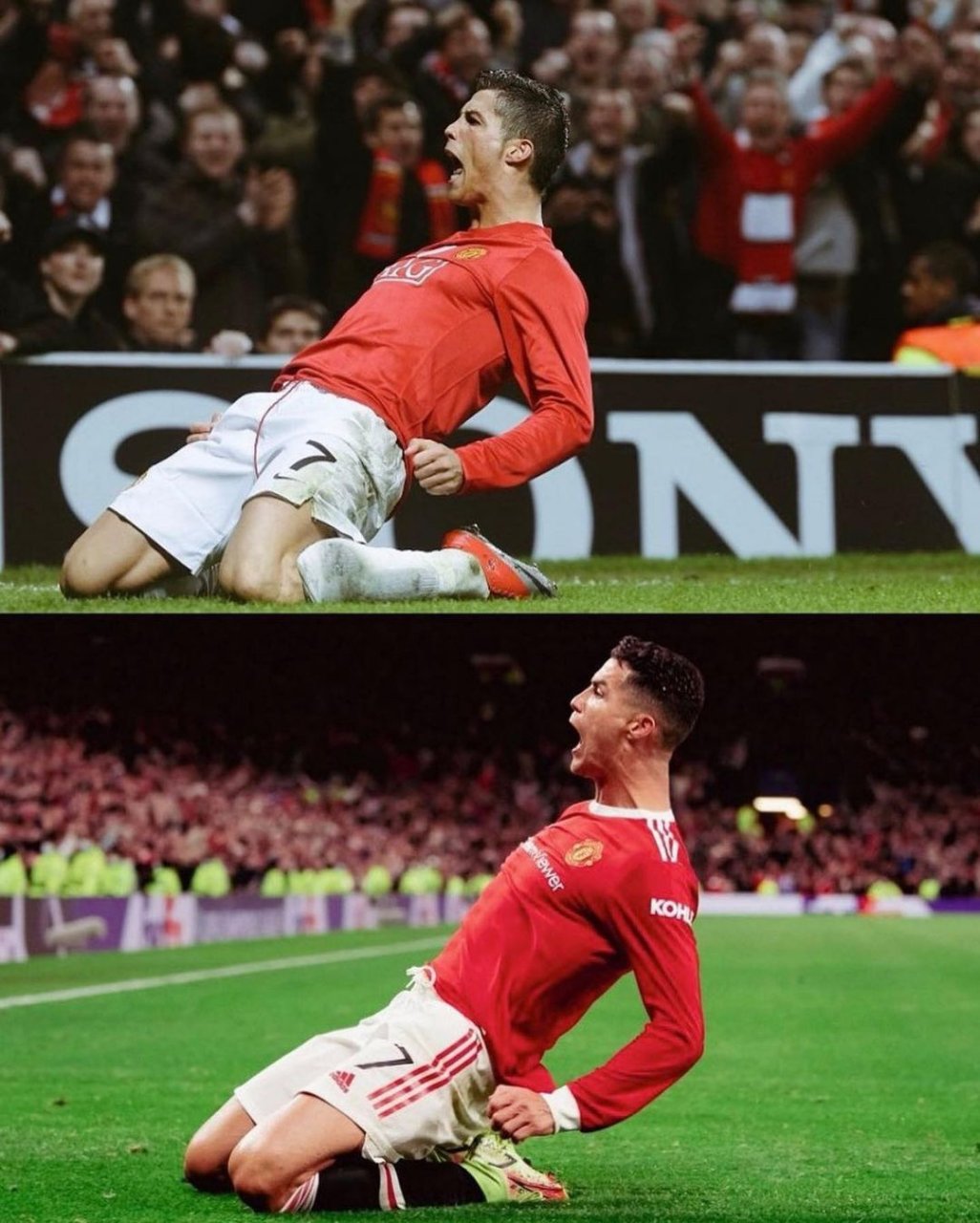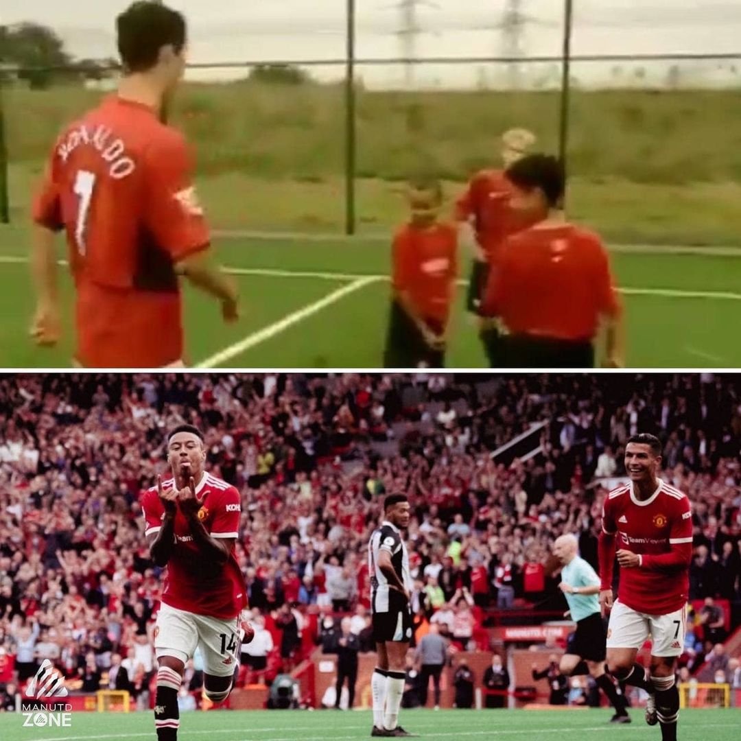 | . 2003: Криштиану Роналду учит малыша Джесси Лингарда скиллам на тренировке 2021: Роналду бежит поздравлять Джесси после его гола | |