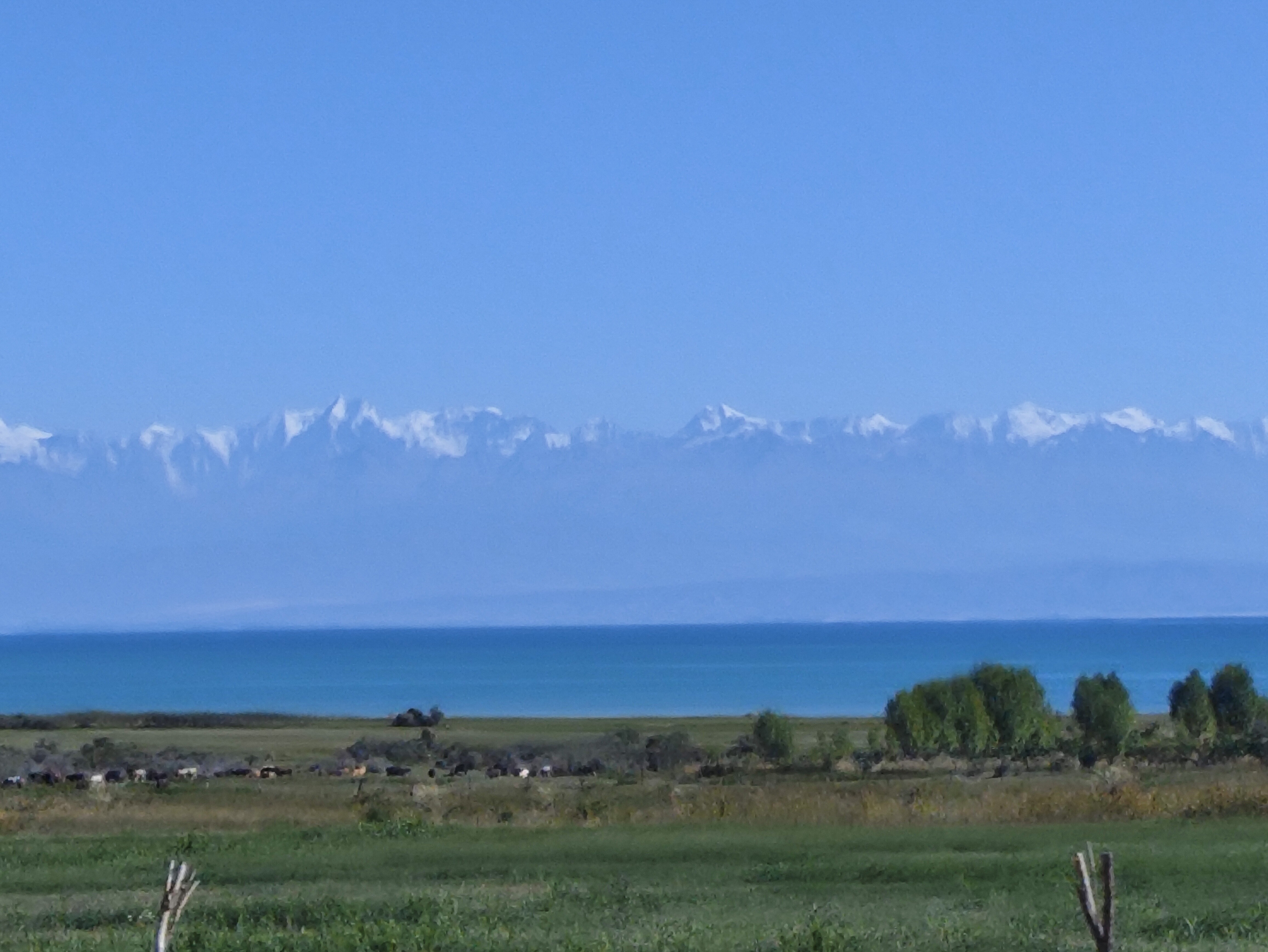 Это вид на юг и южную цепь с северного берега Иссык-Куля, с 70 км. Прозрачный воздух дает такую видимость, необычную в наших низинах атмосферы. ![]() ![]() ![]() | |