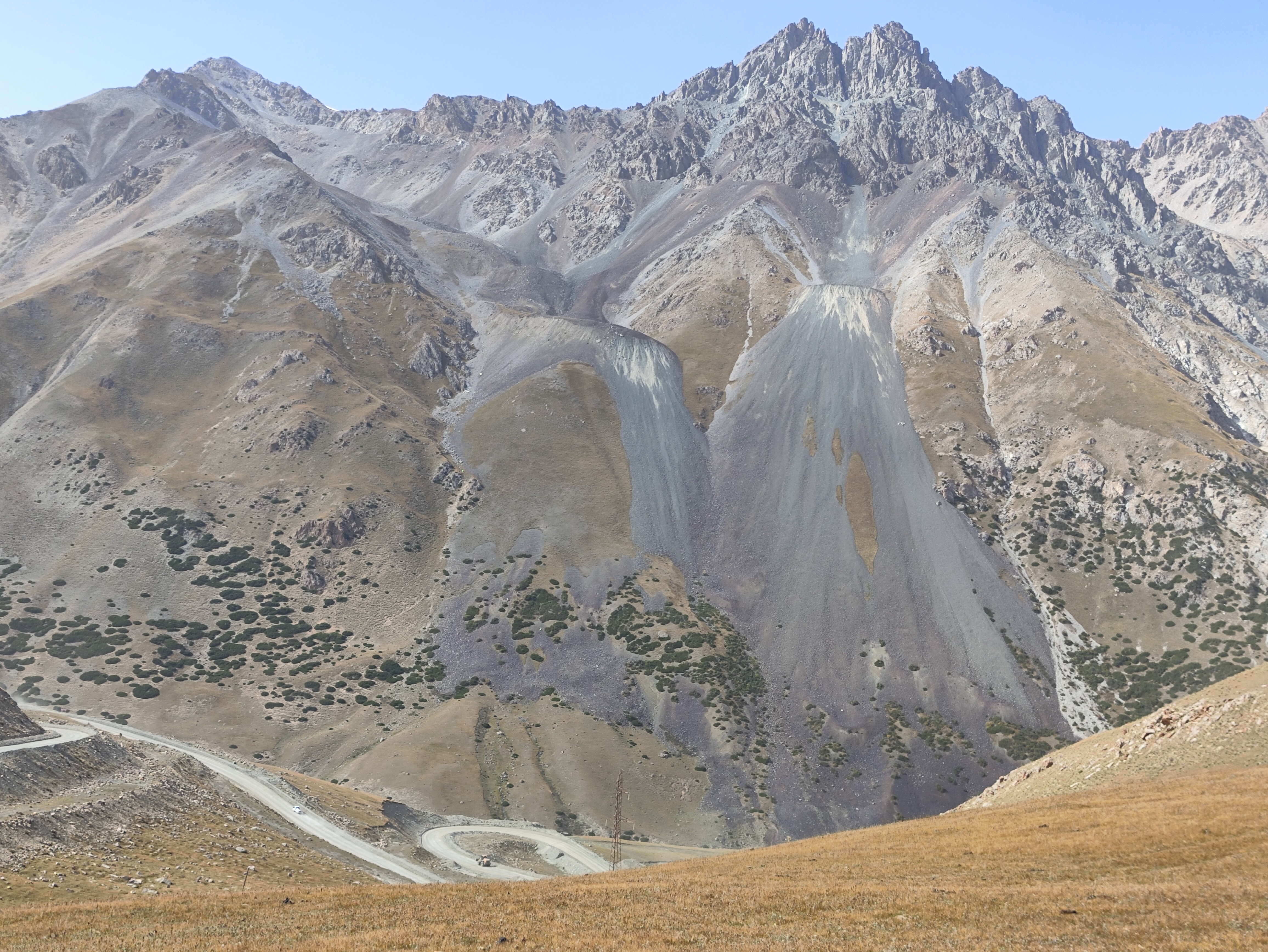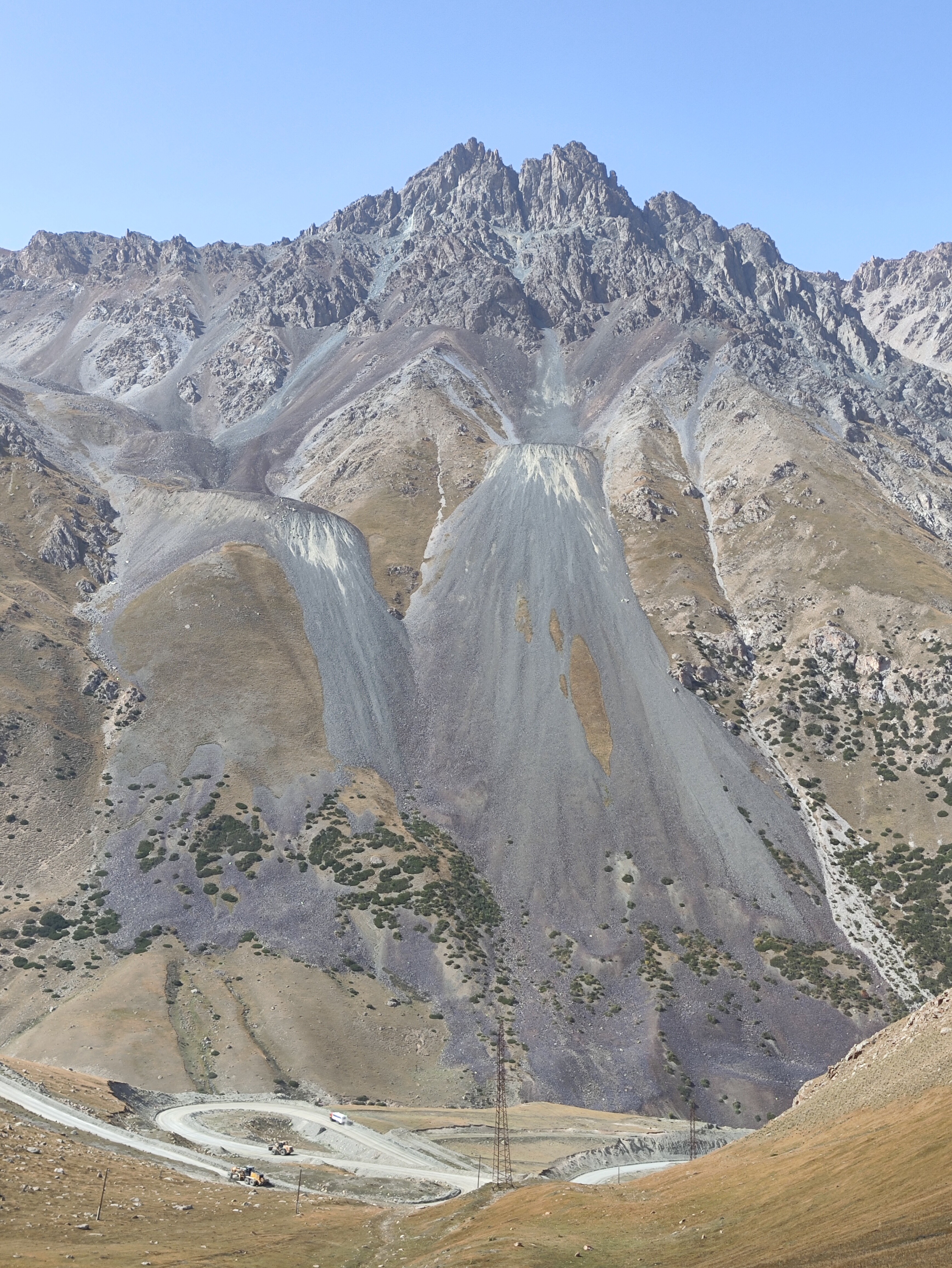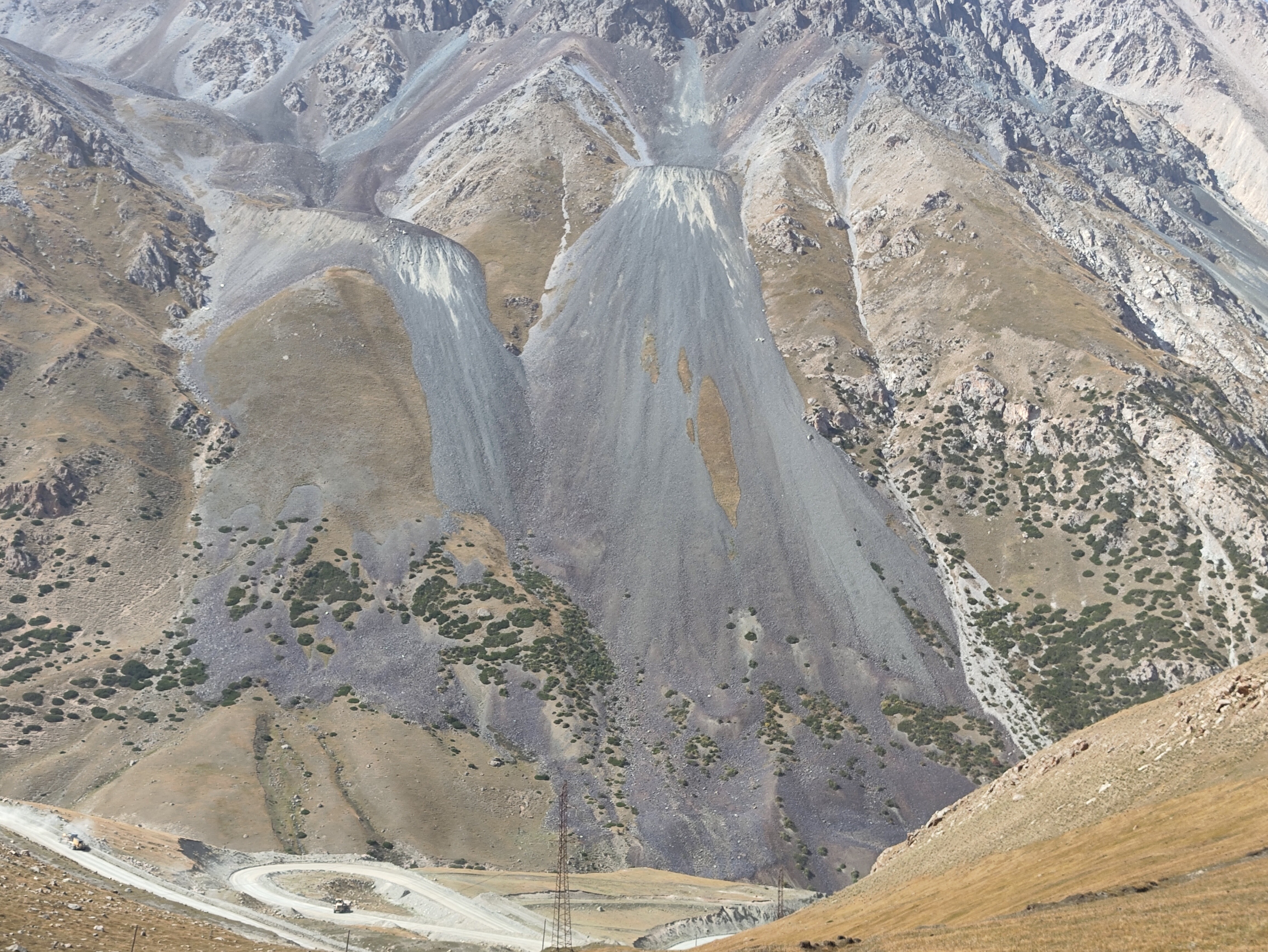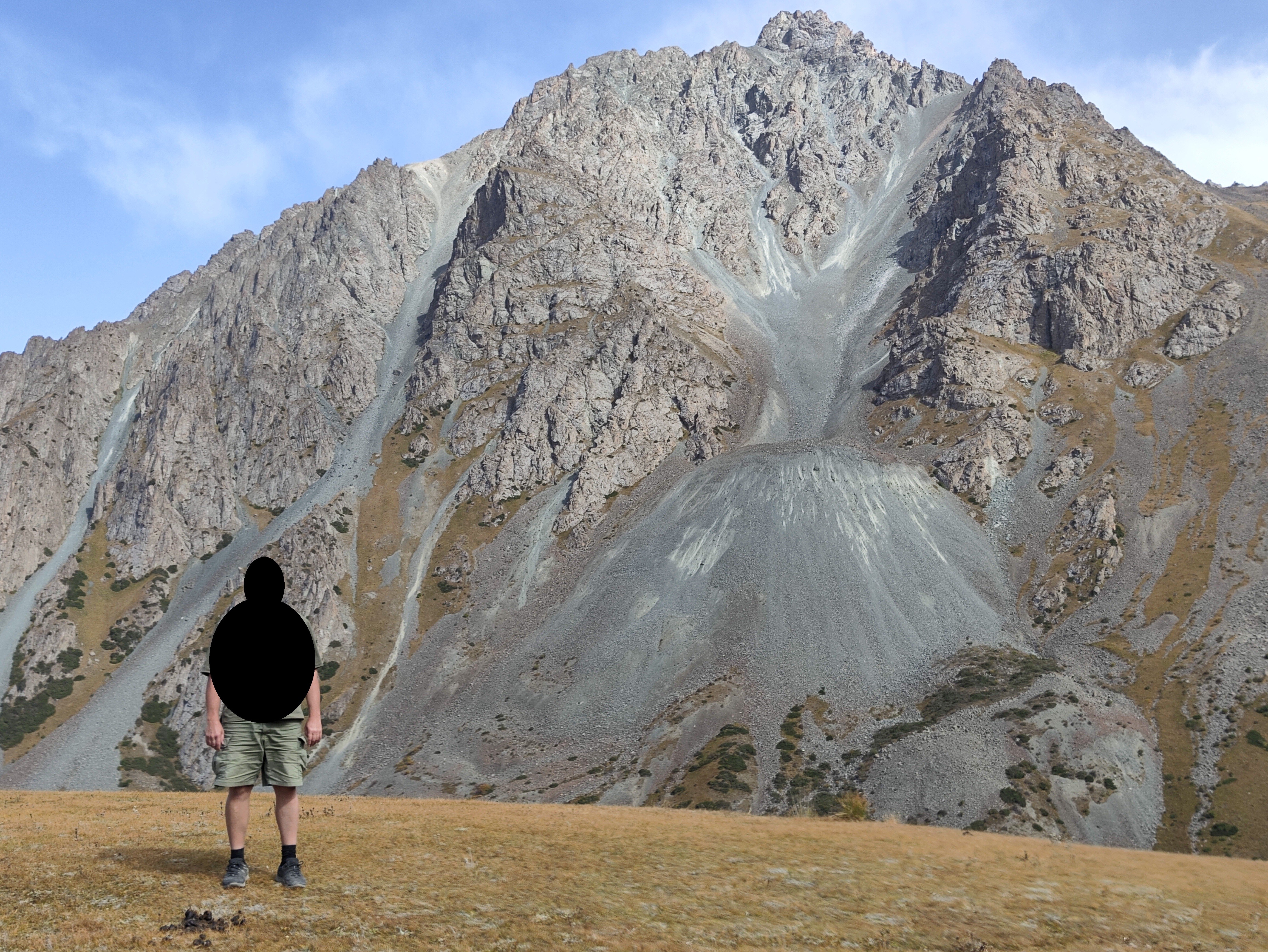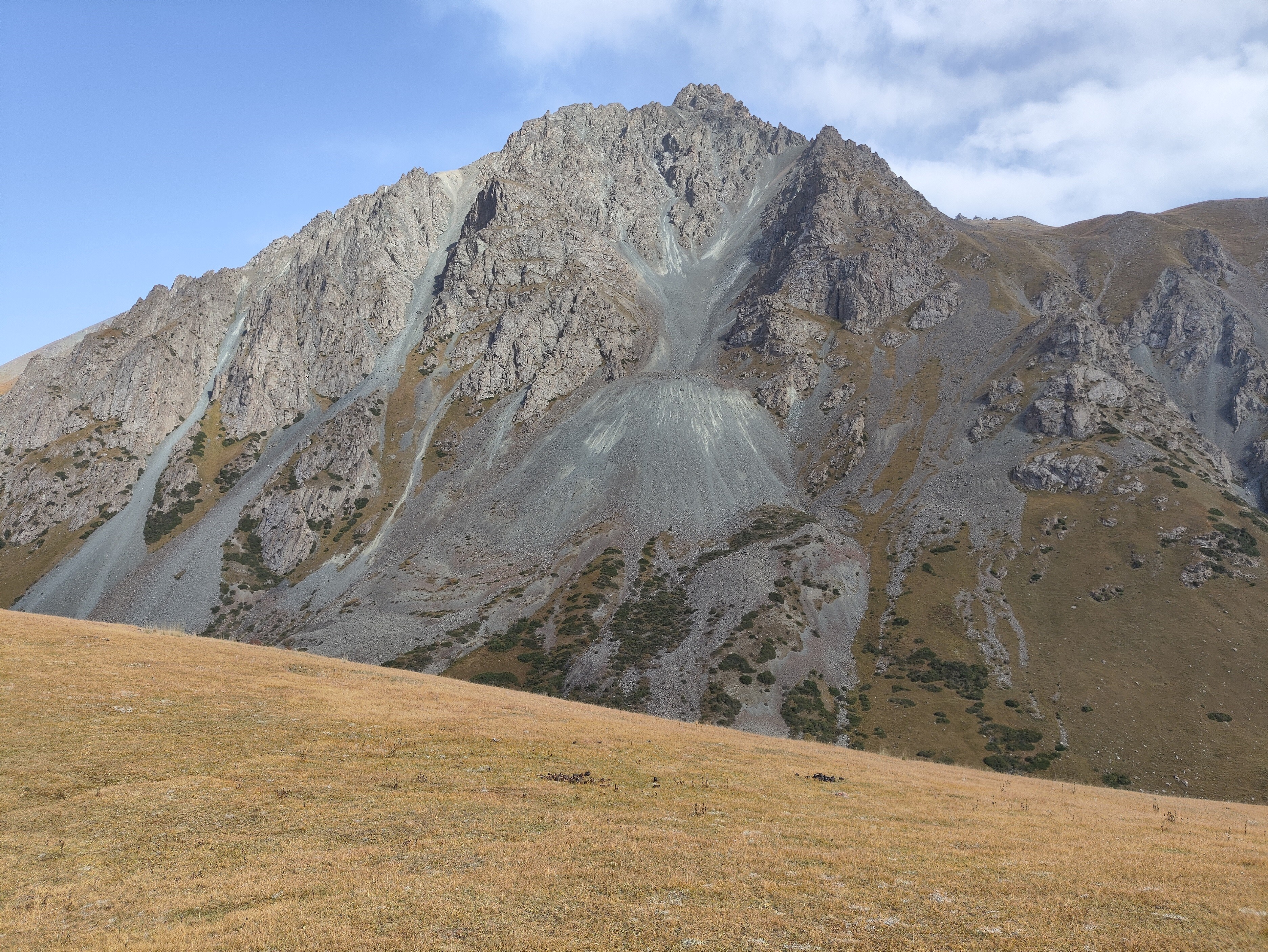 В одном месте, на высоте 3500 м, было видно сразу два таких природных камнемёта, находящихся противоположно друг другу. И сам камнемёт в них абсолютно одинаковый: наверху сильно потрескавшаяся вершина, изрезанная, и потому становящаяся продуктивным источником камней. Под ней узкая воронка, собирающая поток летящих камней в узкое место. И выстреливаемые из этого узкого "трамплина" камни формируют под воронкой вытянутый расходящийся шлейф довольно крутого падения. Такая структура практически одинаковая, и говорит об одном механизме формирования и работы такого "камнемёта". Вот один из них: в нём всё видно как на ладони. ![]() ![]() ![]() | |