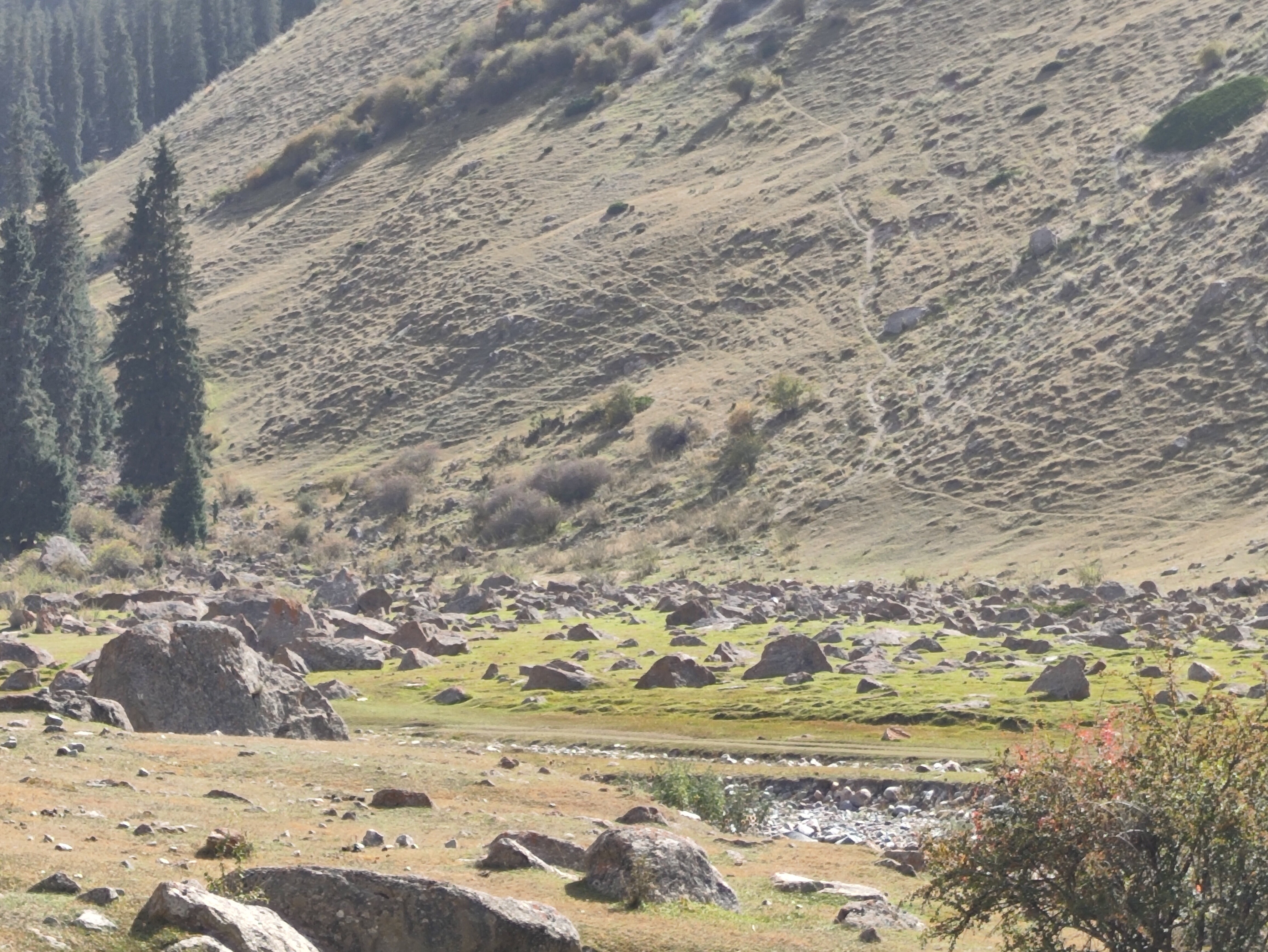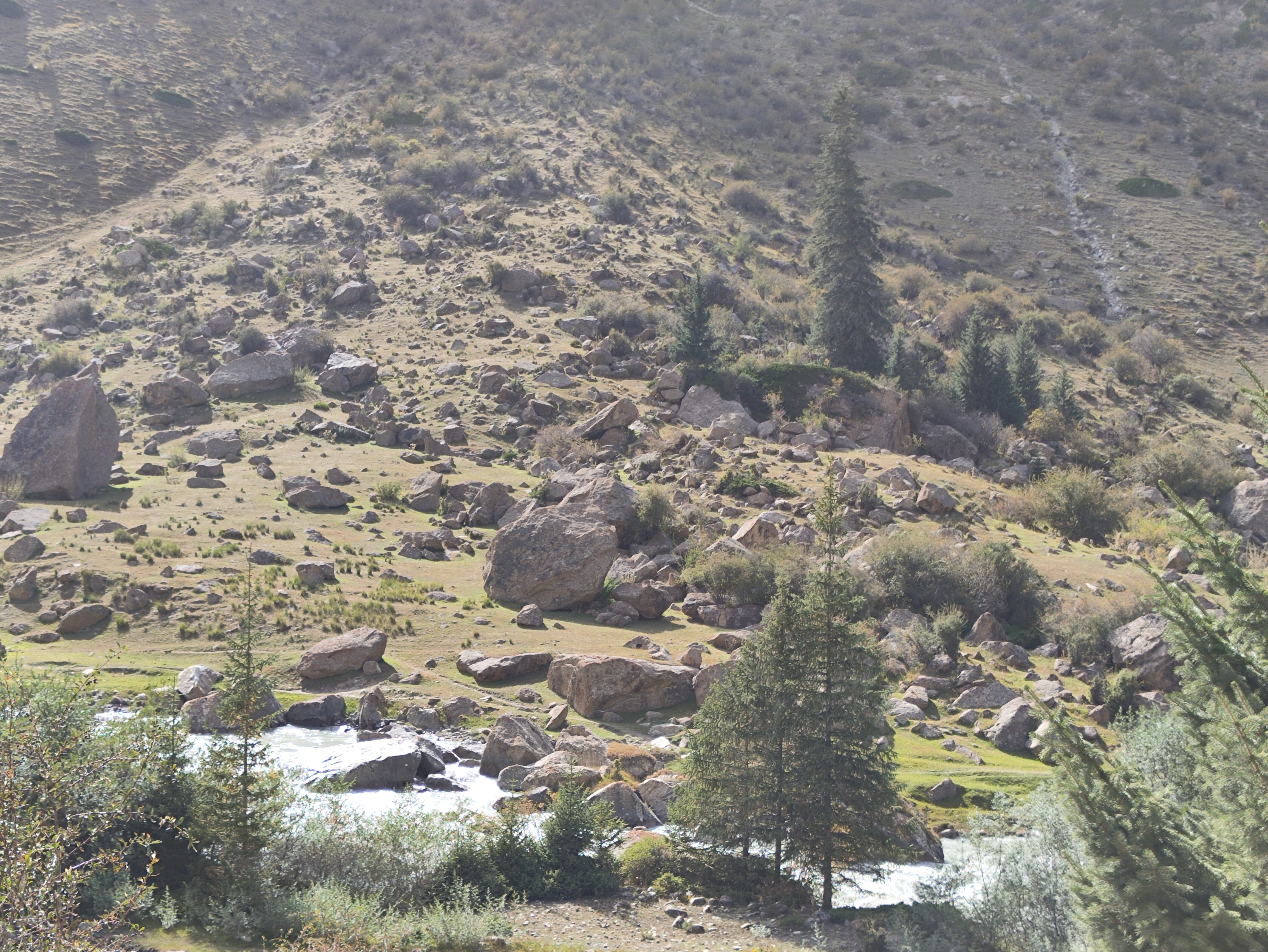 Меня, как обычно, интересуют геологические процессы, и в горах они наиболее полно и плотно визуализируются. Например, снос материала вниз по склону. Механизмов такого сноса множество, и обваливания, и осыпания (их различают), и вымывание с лавинными выносами, и тд. Соответственно, такой снесённый и накопленный ниже материал разного рода имеет свои геологические названия: аллювий, пролювий, делювий, элювий (этот не снесён, лежит там же, где и образовался). На узких подошвах внизу склонов местами довольно красочен коллювий - неокатанный крупнообломочный материал. Местами его становится так много, что может сделать подошву трудно проходимой на лошади или пешком. Вот пара примеров такого коллювия, здесь вполне умеренного. Но живописного - это природные сады камней разной плотности. Фото неудачные, солнце светило навстречу, засветив снимки; но представление о коллювии они дают. ![]() ![]() | |