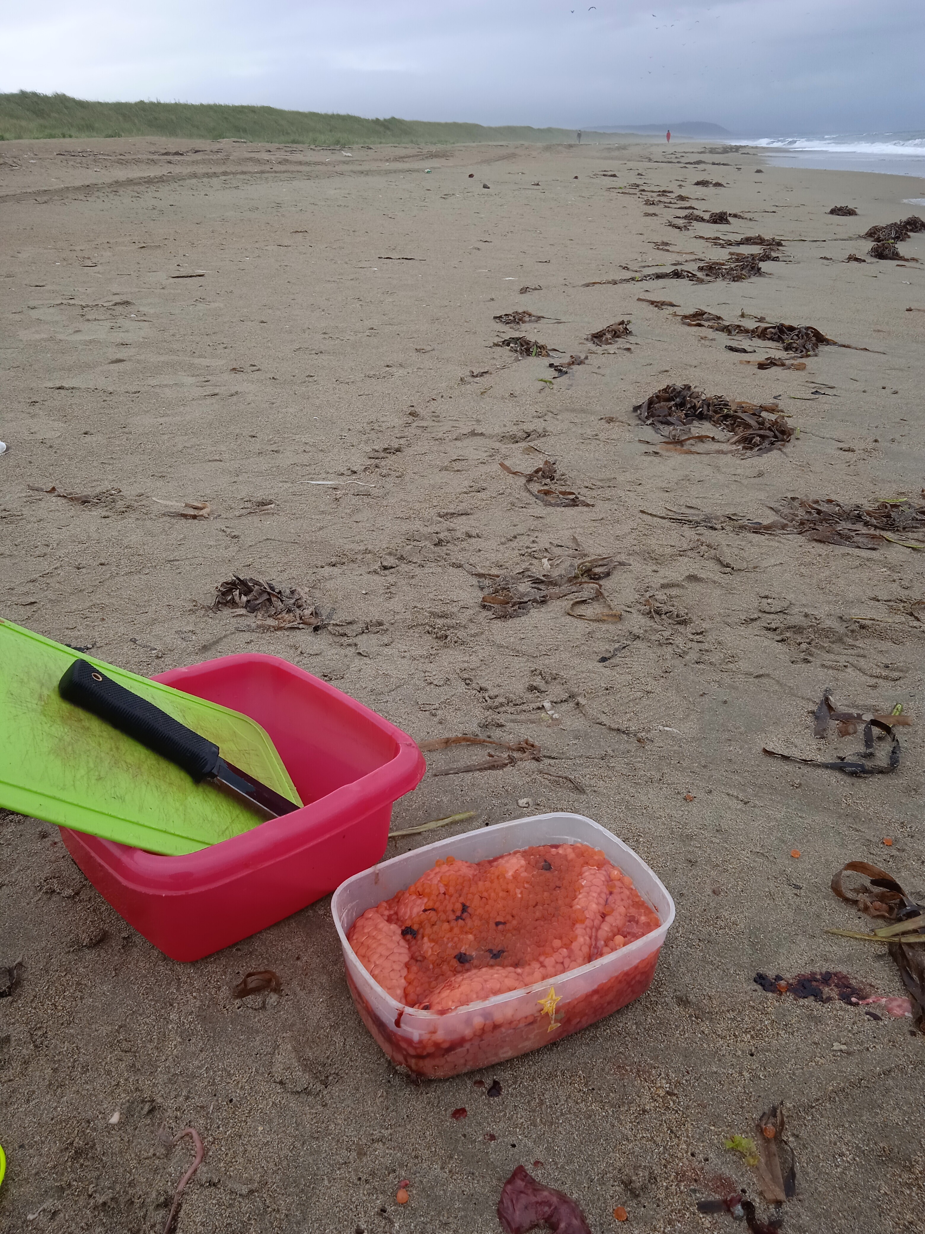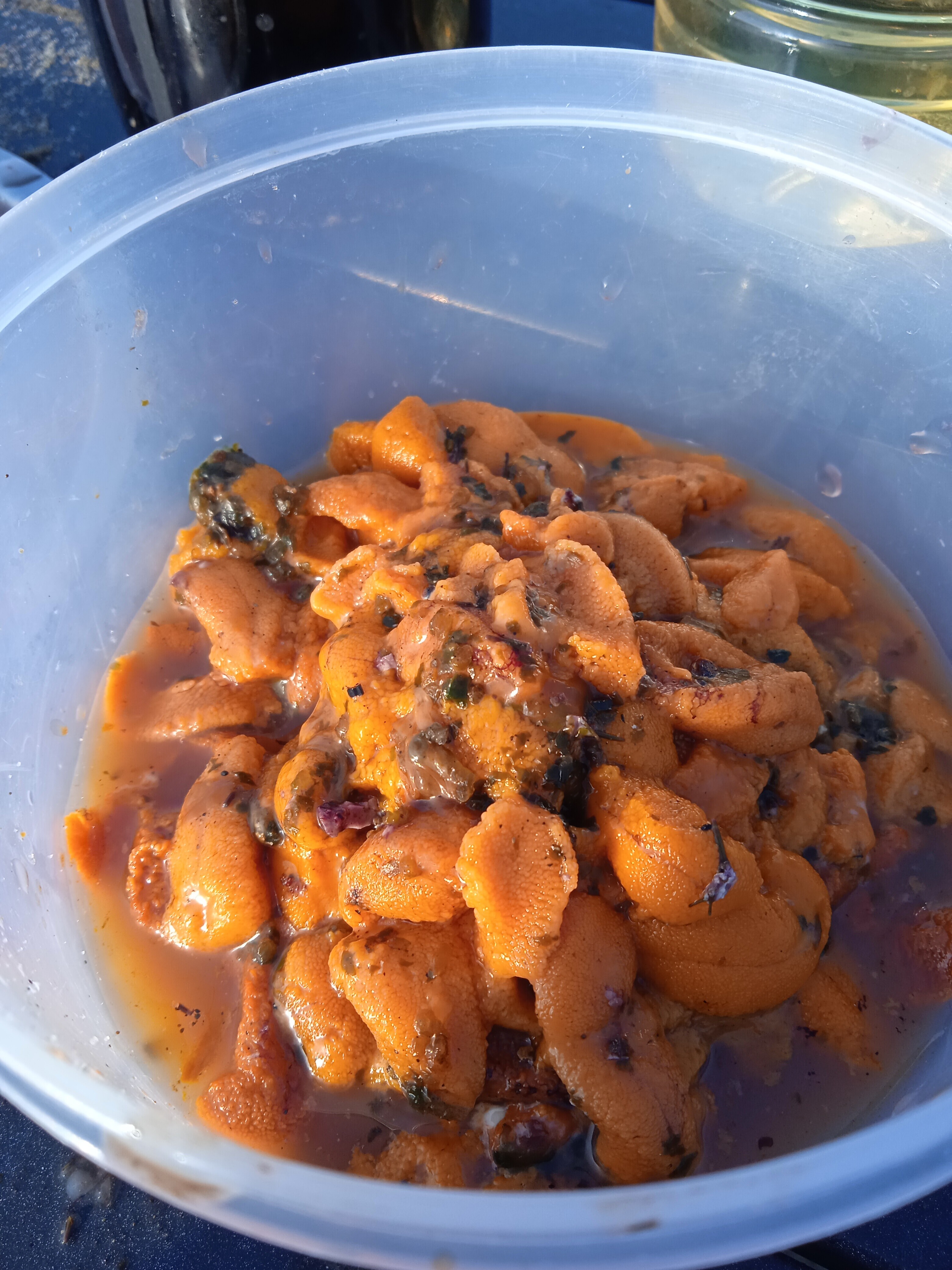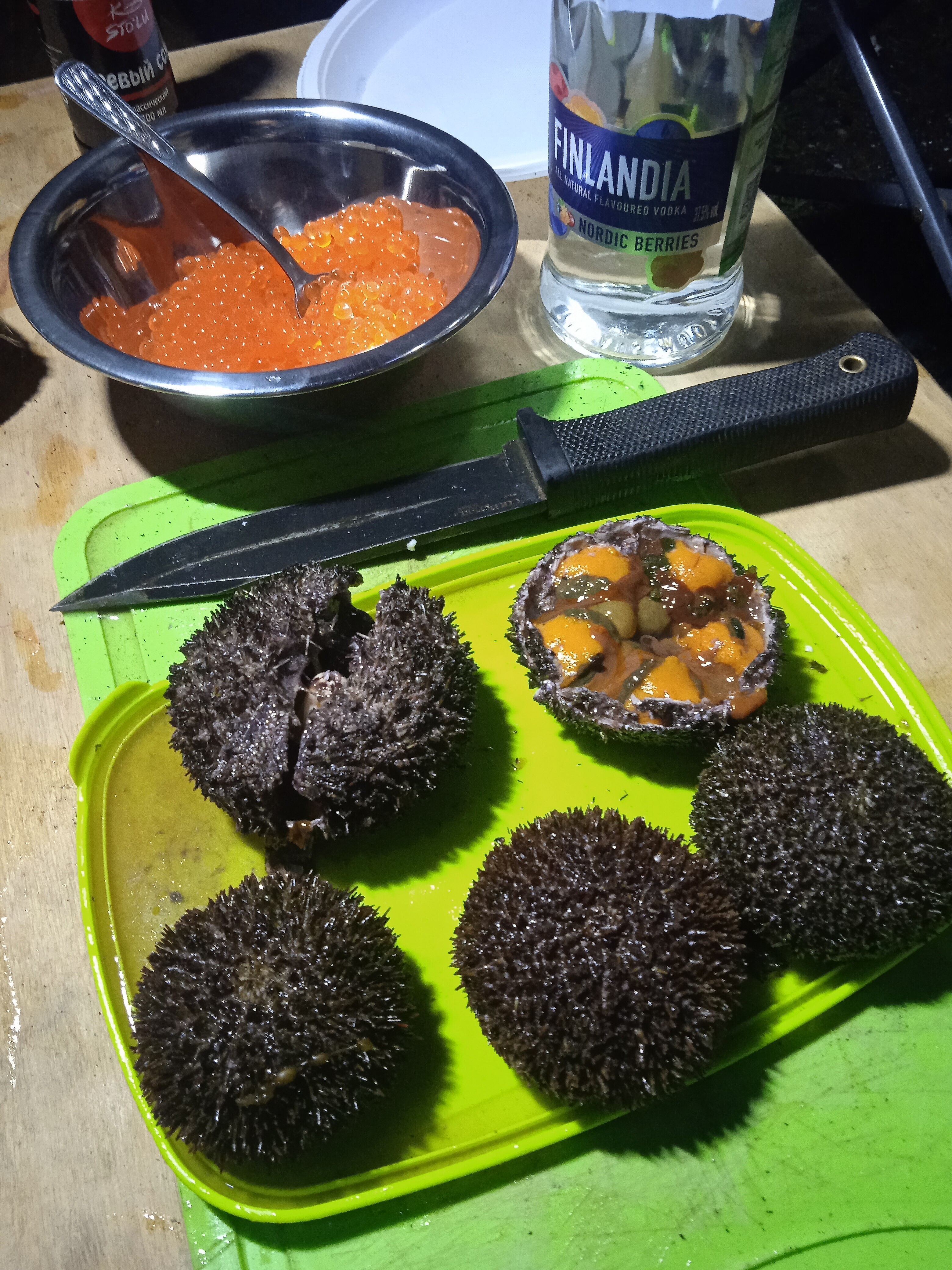 1140-Шухер > Это как раз не самые большие по размеру, гребешок Шмидта в целом небольшой. Но мускул у них относительно крупный, практически такой же, как у обычных крупных гребешков. Моллюски как моллюски, приходится чем-то питаться. В целом не хуже устриц. Морские вам не очень - понимаю; предпочитаете небось виноградных улиток с чесноком и сливочным маслом, да под молодое божоле? Сейчас как раз его сезон. 1141-Alisalisa > Обычный утренний и вечерний рацион. Икра сделана собственноручно за полчаса до этого фото из горбуши и кеты, выловленной за час до фото. Так каждое утро и каждый вечер. Днем тоже можно, если есть настроение. Если на поздний обед, икру держим просто в неразделанных рыбах. Или с утра побольше готовим. В общем, как придётся. Надо же что-то есть посреди дикой природы. Вот и приходится побираться дарами моря, как мезолитические собиратели. | | |