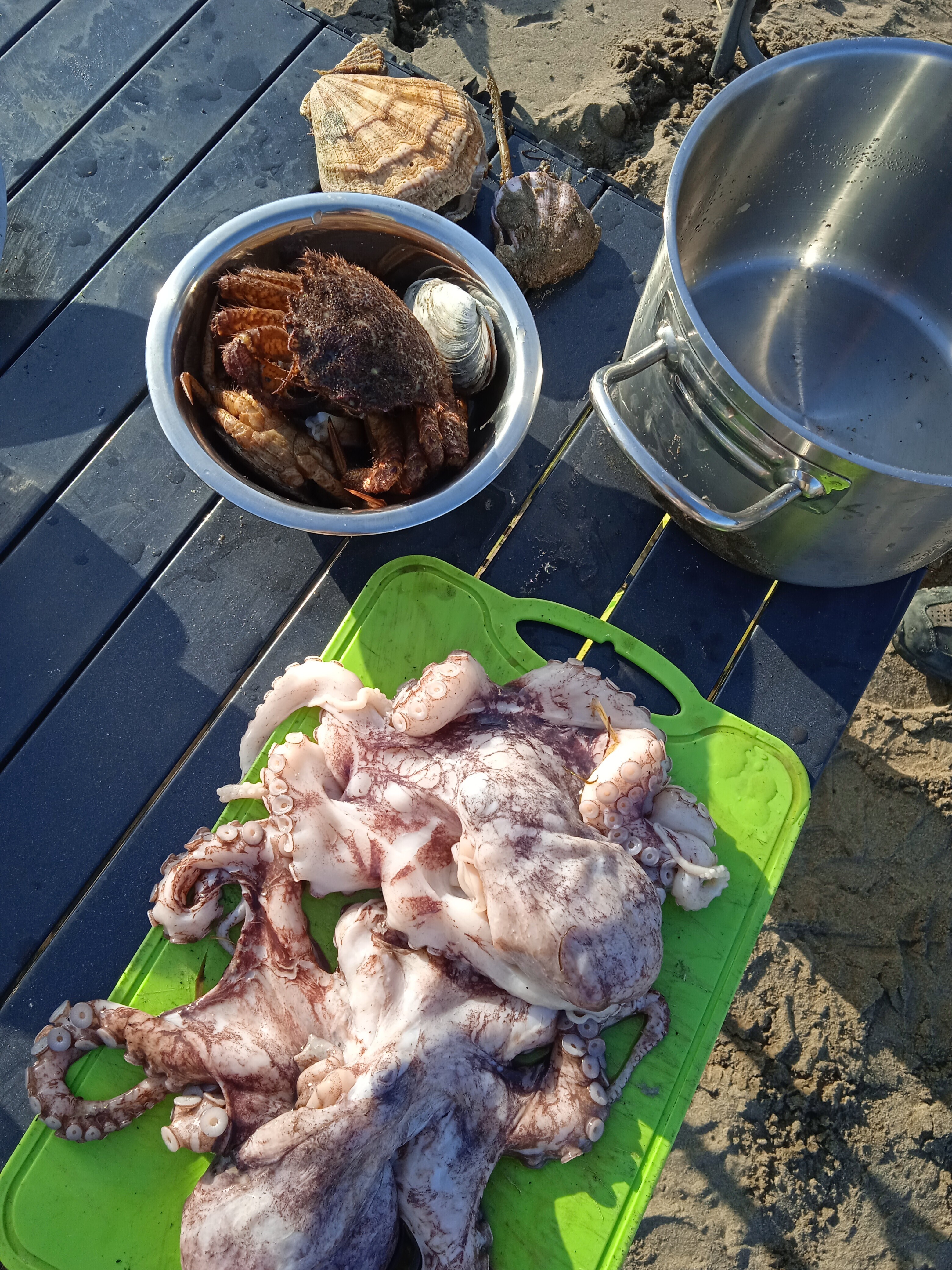 Для дальнейшего скромного ужина поздним вечером под шум прибоя. Неказисто, просто, чисто еда прибрежных собирателей, без затей. Ну, что бог посылает, то и ладно, неприхотлив в еде. ![]() ![]() ![]() | | |