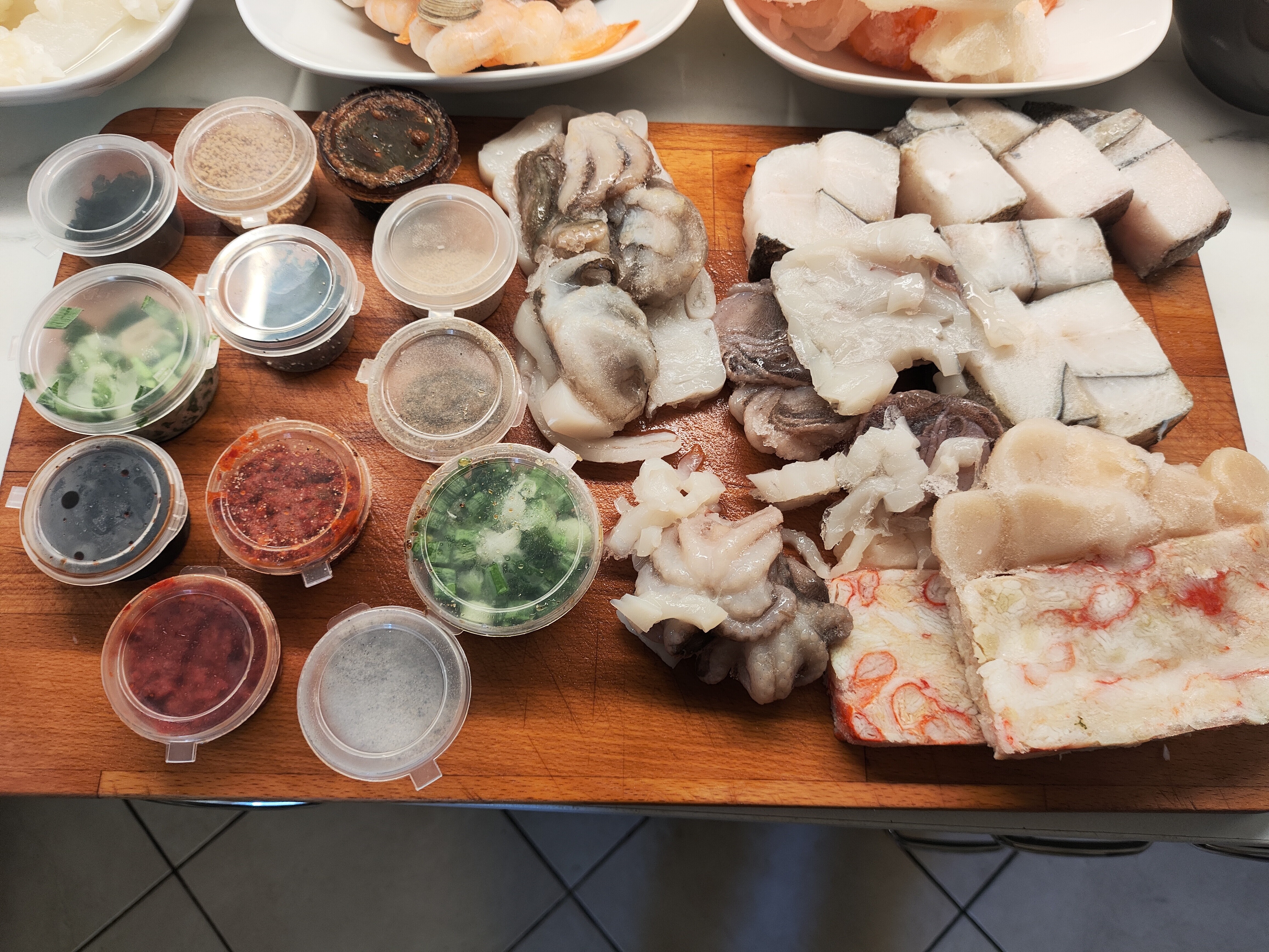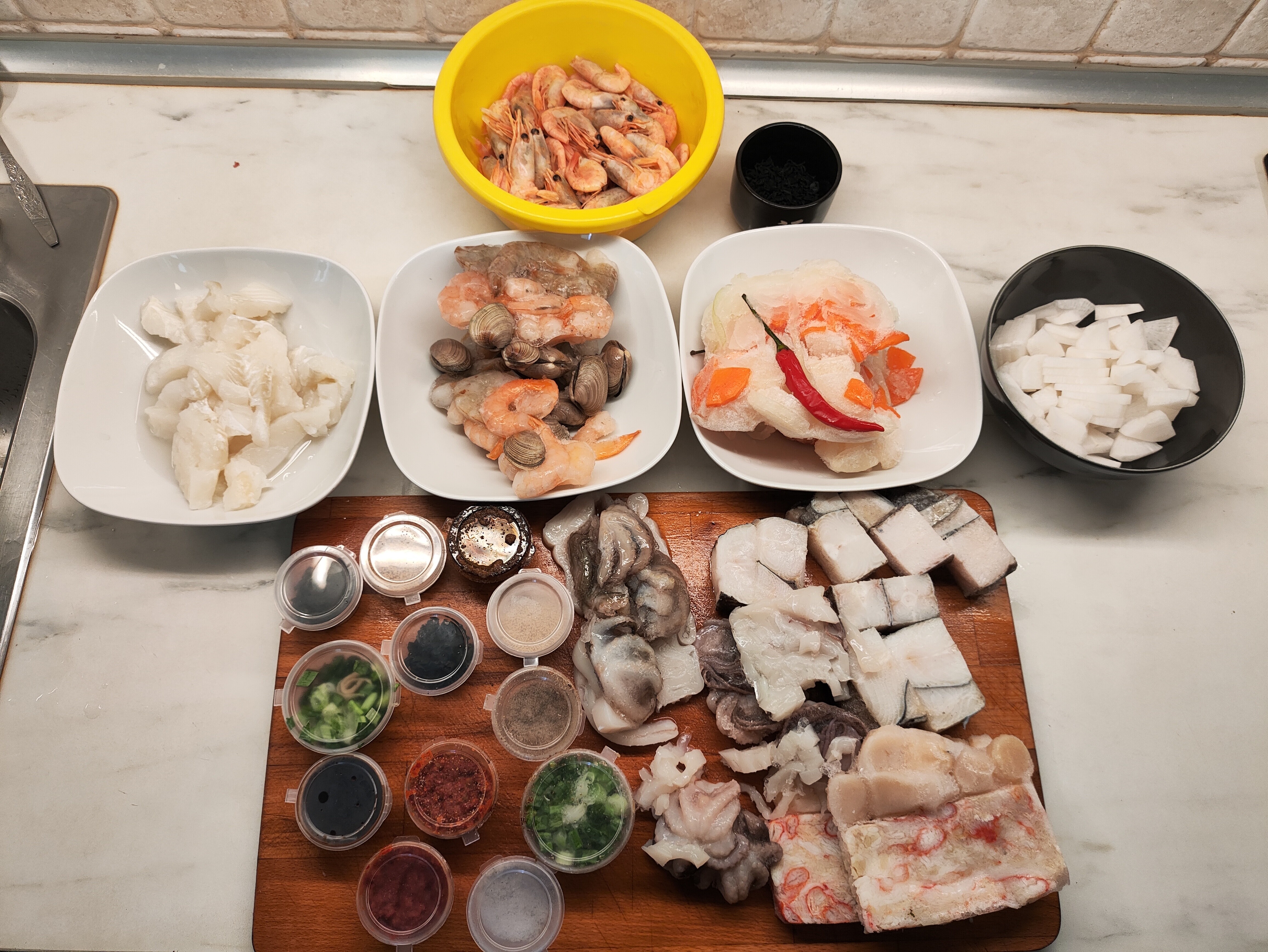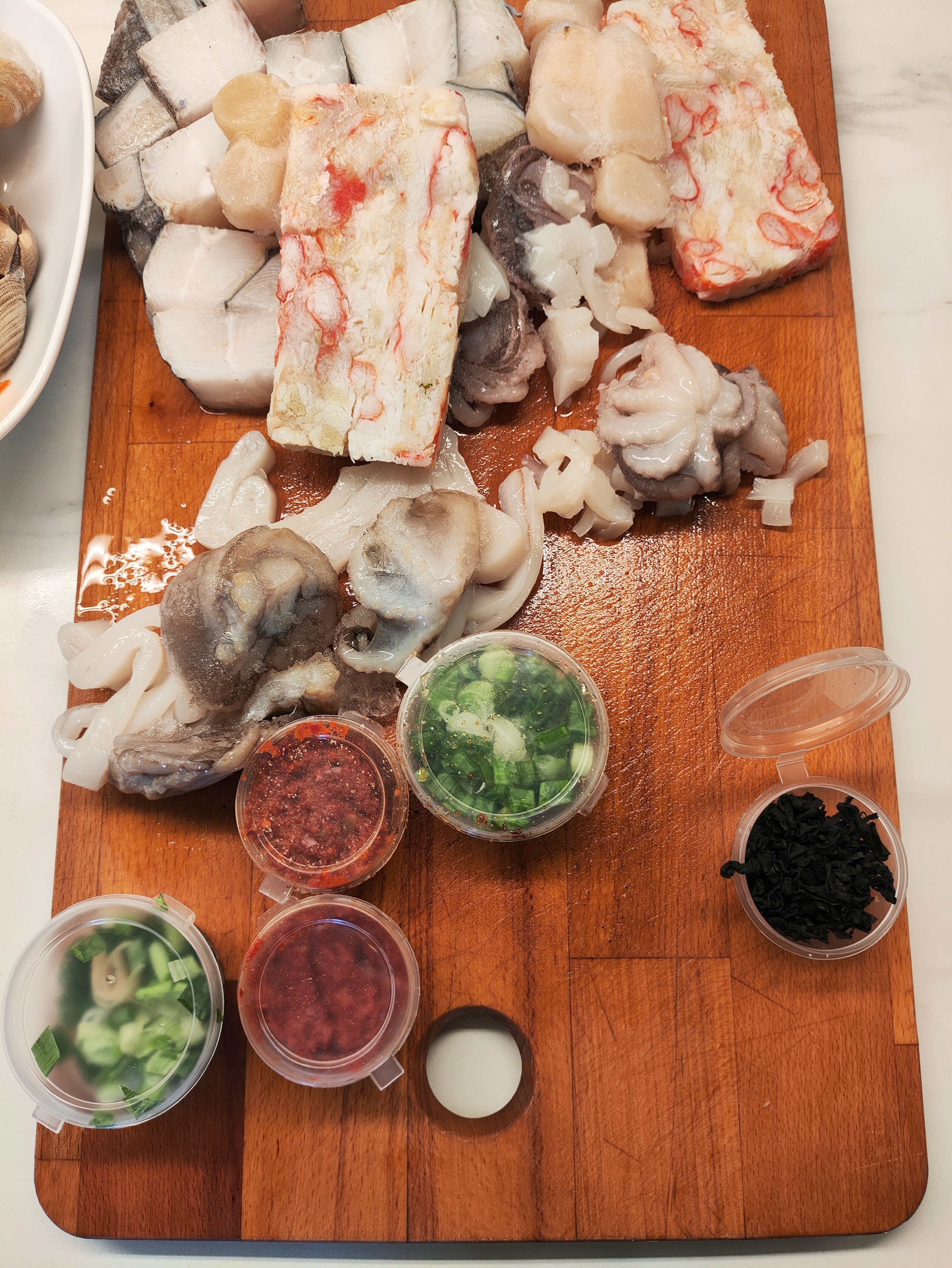 Сахалинские корейцы ценят и любят хемультан. Но его компоненты изобилуют в разные времена года. Краб идёт зимой. Палтус ловится летом (точно не знаю когда, сорри у рыбаков). Сахалинские корейцы придумали собирать все компоненты в один набор для хемультана, упакованный в один мешок. Там есть всё, что нужно. Ничего суррогатного - настоящие ракушки. осьминоги, настоящее мясо краба, разные креветки, всё по чесноку. Все специи , включая рыбные особые вкусовые концентраты, настоящие, в маленьких баночках. Но подлинные. Делаются наборы на 4-6 и 8-10 персон. В итоге можно купить такой набор, и приготовить настоящий хемультан когда хочешь. Чтобы было наглядно по качеству: по весу такой набор стоит как такой же вес красной икры. Это весьма недешёвая штука. Время от времени прямым авиарейсом из Южно-Сахалинска мне доставляют такие комплекты в термоконтейнерах. Что делать, такова жизнь. Остаётся только показать его в разобранном виде со вчерашней практики. | | |