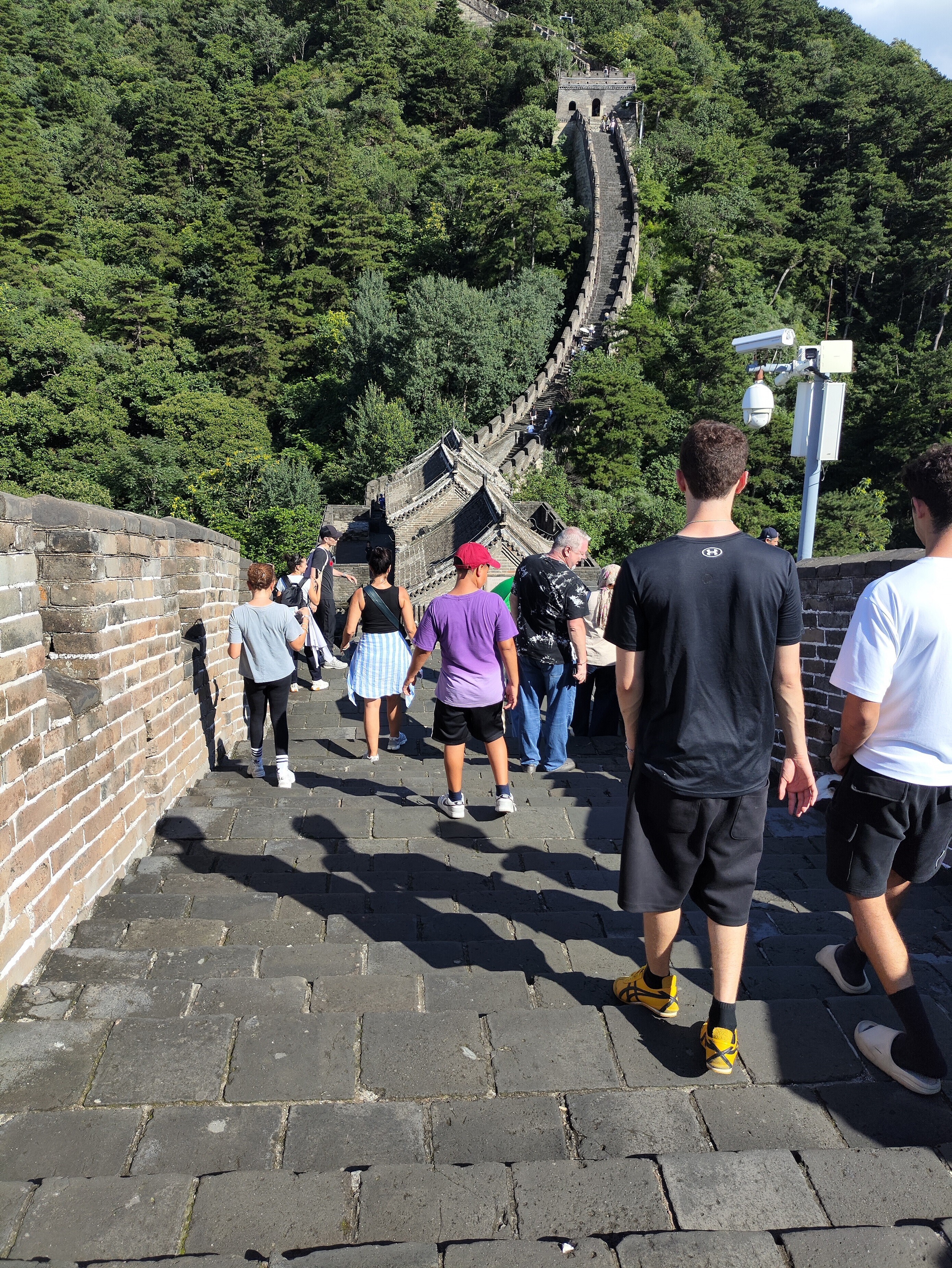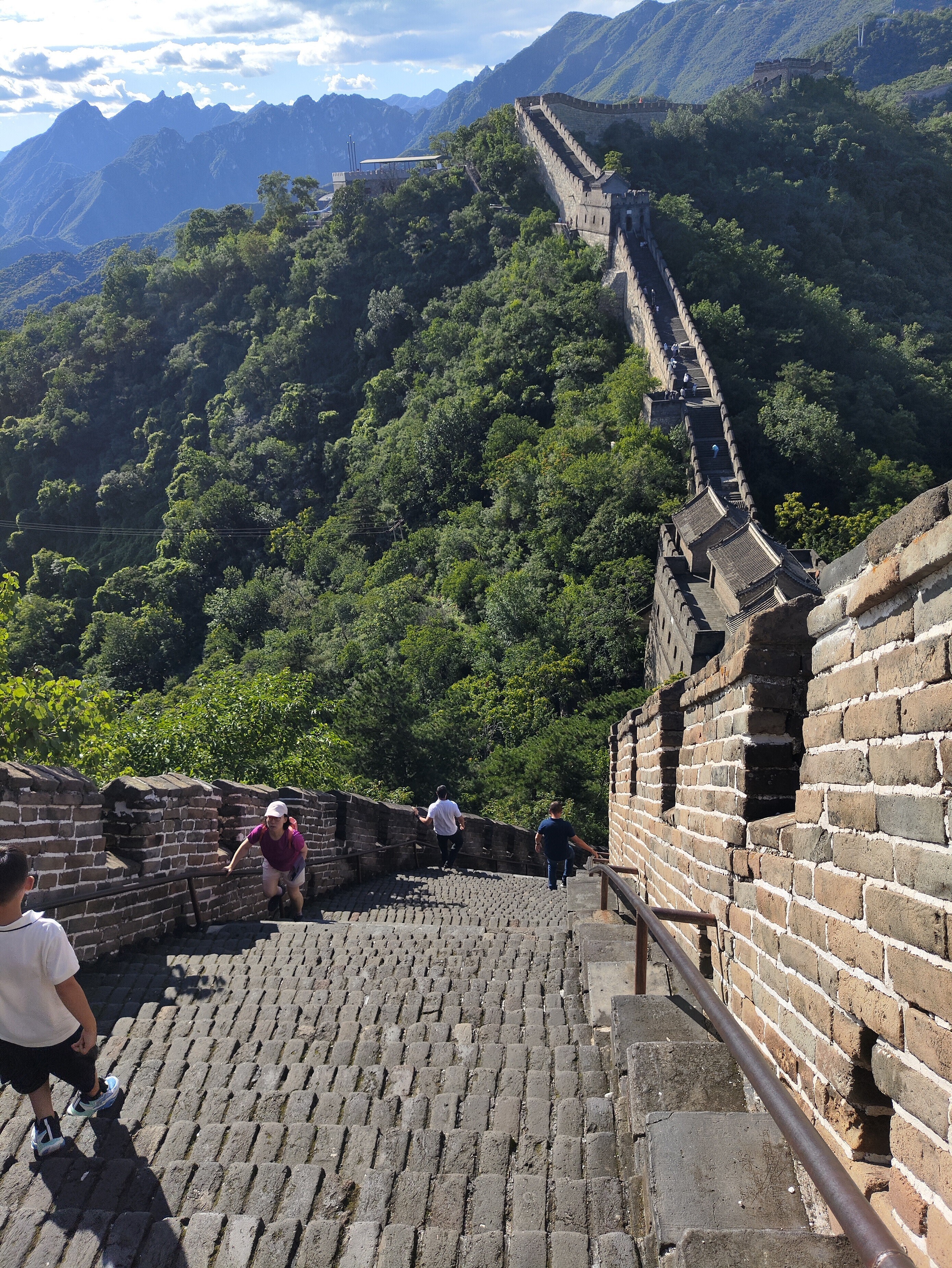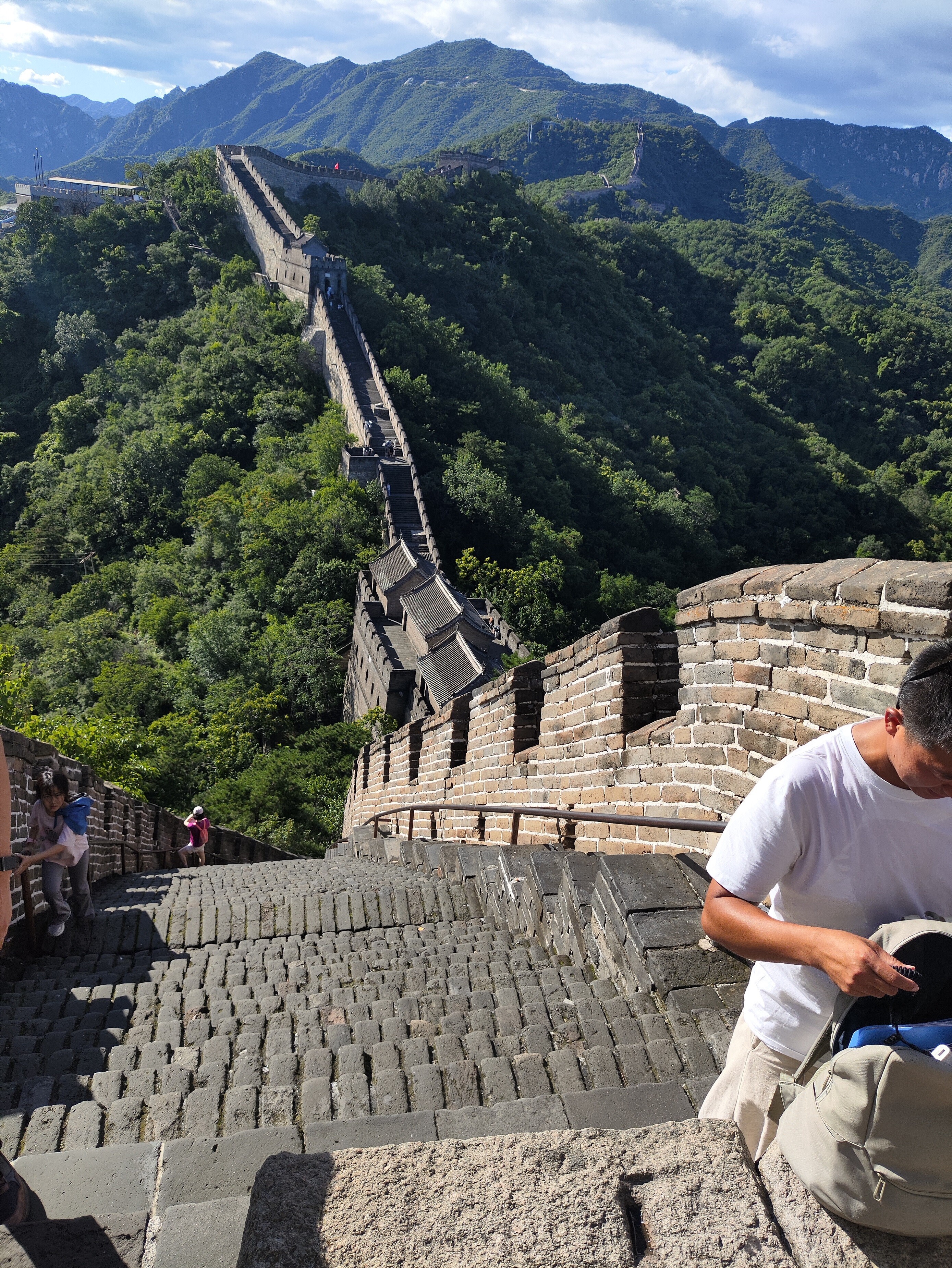 | Кирпич новодел, Монотипия. Но это не уменьшало того, что в метре-полуметре под ним лежал древний массив материала ещё с того времени, 2200 лет назад. То есть сама основа стены подлинная - где ещё найдёшь сейчас столь колоссальное количество материала? - но наружная форма восстановлена вот этим новым кирпичом и кладкой. Этот участок стены открыт для посещения несколько лет назад. А всего на стену разрешен доступ на девяти участках. Строго по предъявлению паспорта, что "белым обезьянам" (так в Китае называются европеоидные иностранцы), что самим китайцам. Есть участки равнинные. Профессор, например, посетил стену в нескольких местах. А в этом месте бывал впервые. | | |