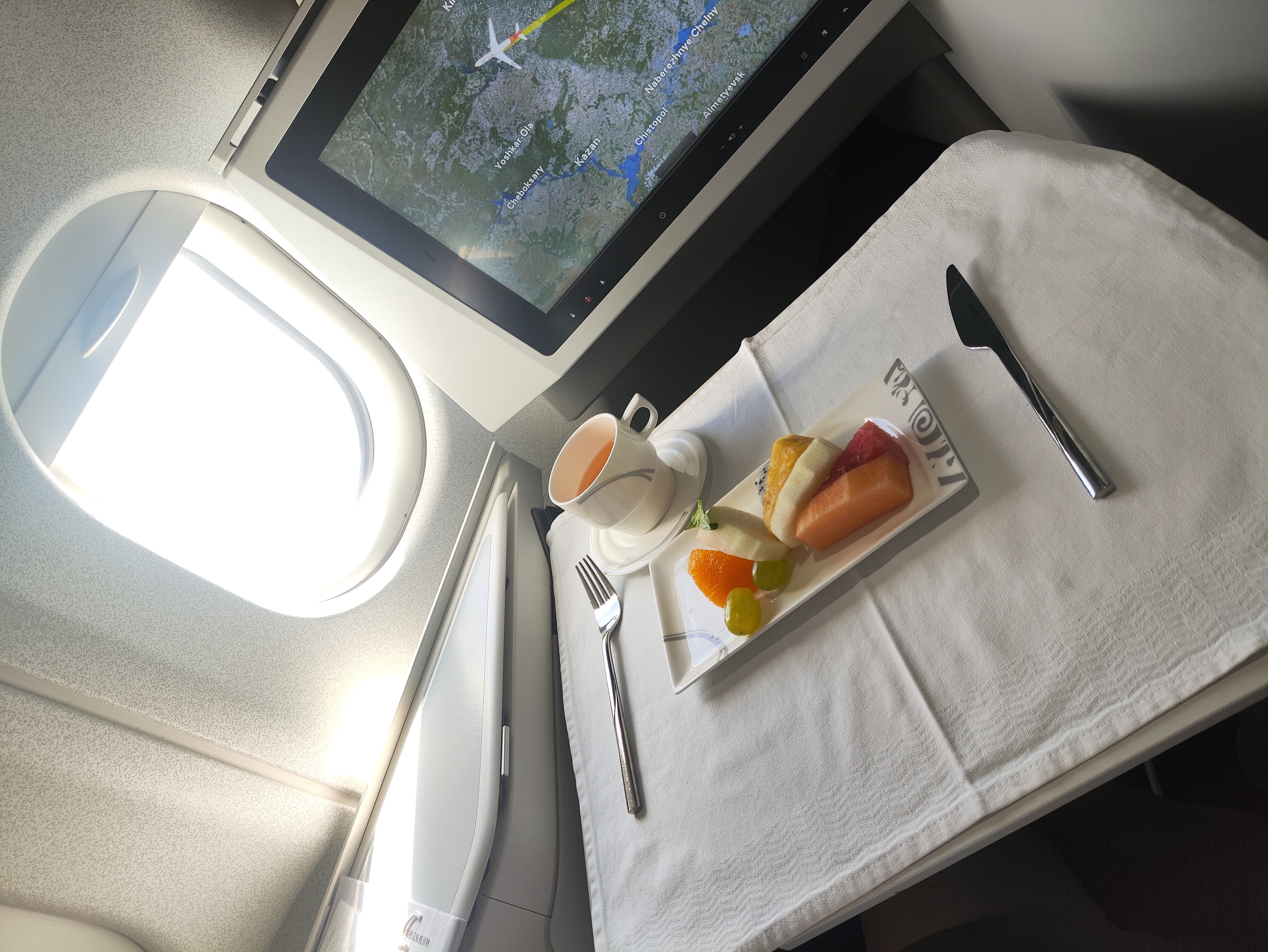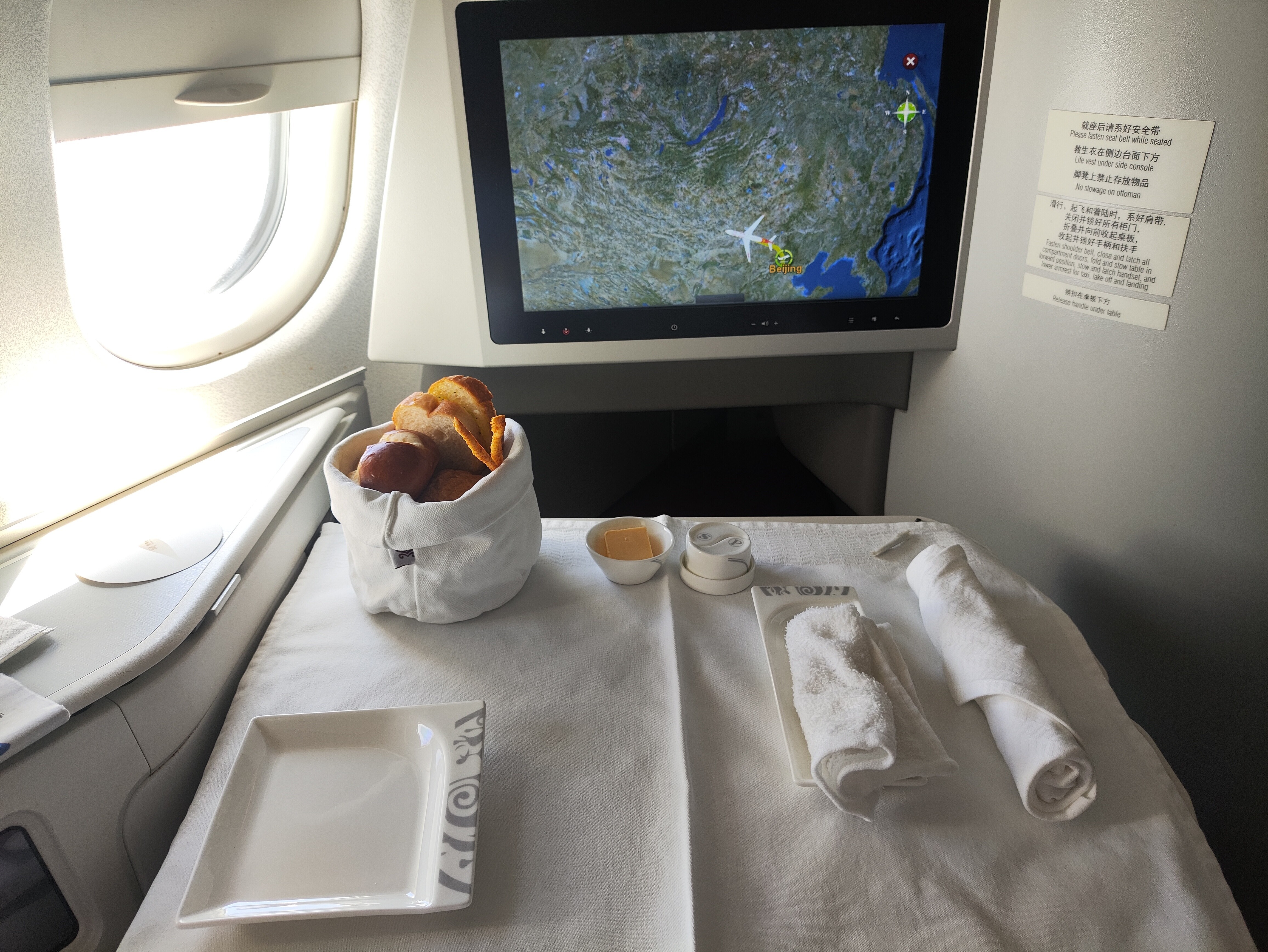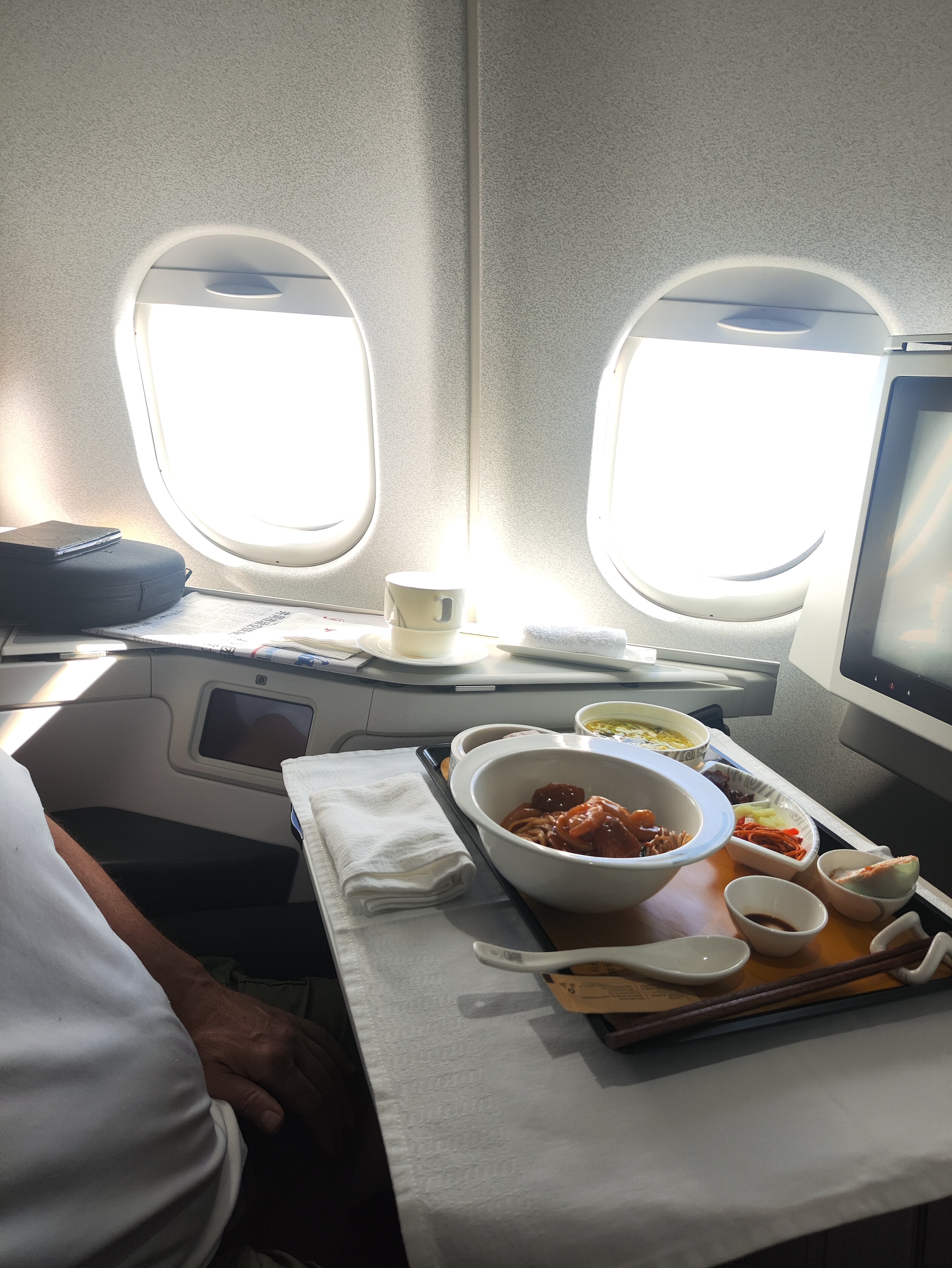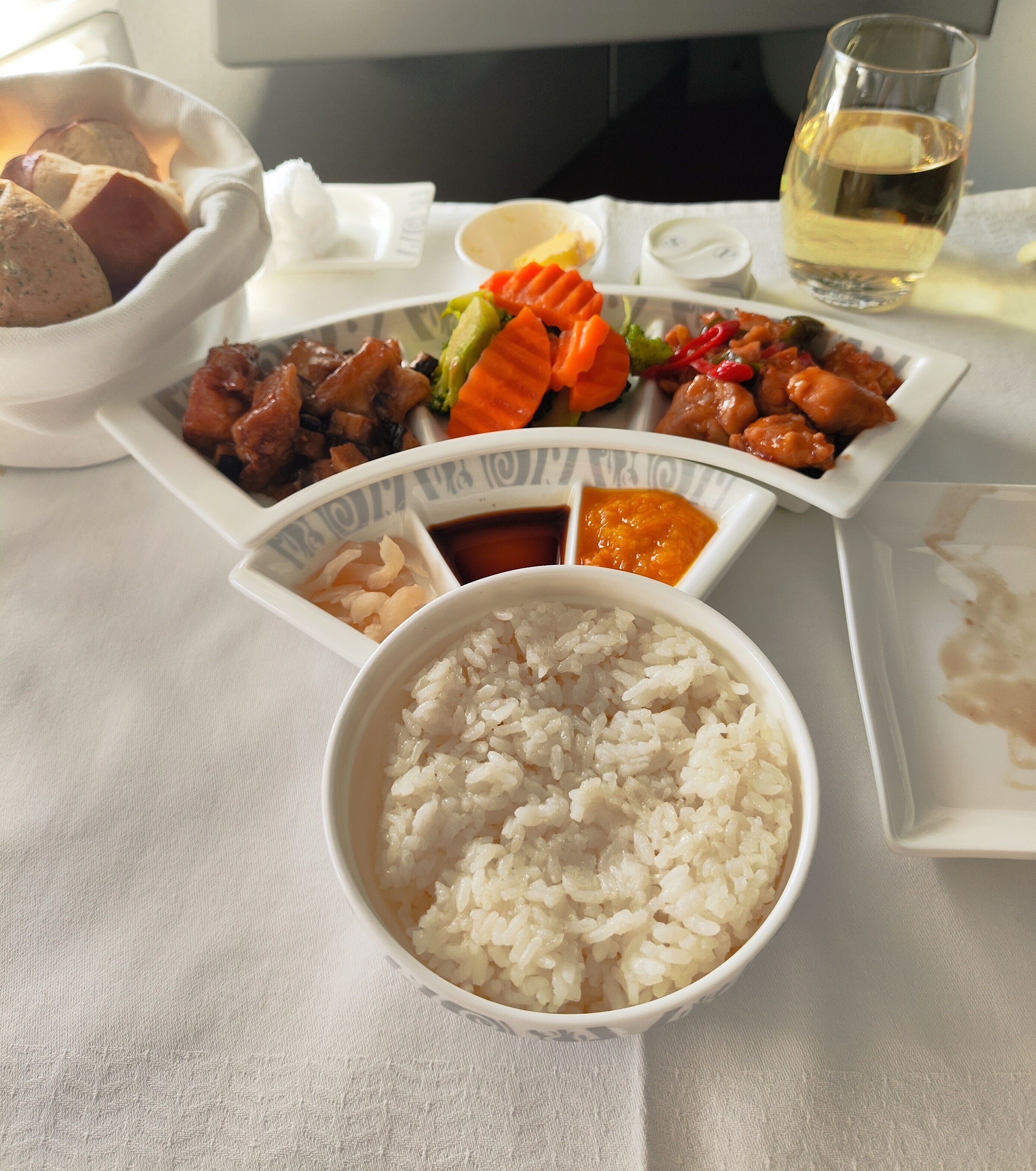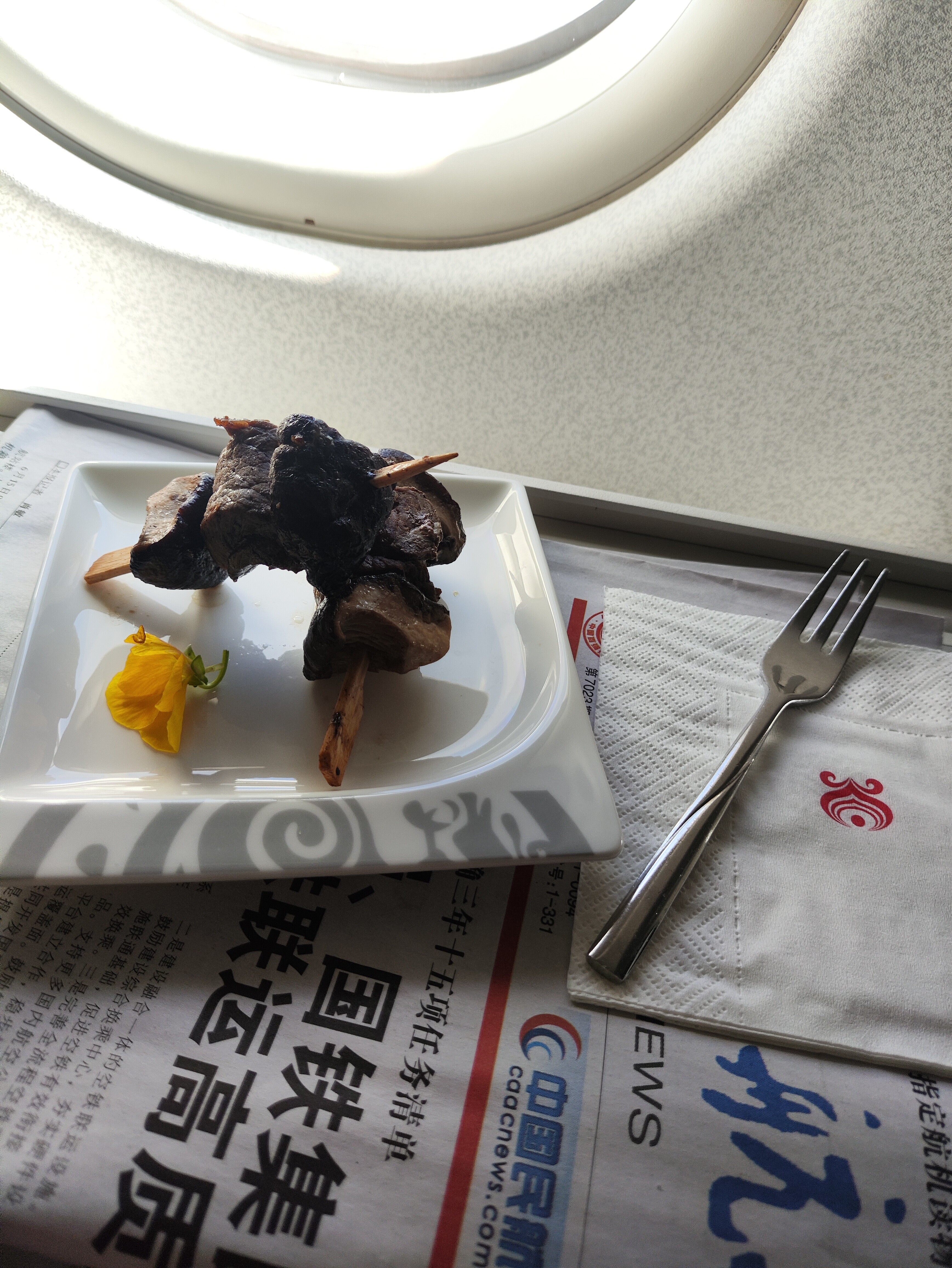 Вскоре после набора высотного эшелона пришла стюардесса, накрыла скатертью и сервировала стол. Принесли шашлычок из двух кусков говядины и белого гриба. Замет свежие мягкие булочки в хлебнице, и набор самых разных вариантов еды; в логическом фокусе находилась большая чашка с чифаном - варёным рисом. Запивая всё шампанским, налитым для устойчивости в стакан, а не бокал на тонкой ножке, я занялся обедом. Что ж, пока-пока, пекинская еда! И, однако, это был ещё не самый последний раз. Спустя некоторое время принесли и легкий ужин, тоже согласованный мною ещё до взлёта. Пекинская еда так просто не отступает!) ![]() ![]() ![]() ![]() ![]() ![]() ![]() ![]() ![]() ![]() | | |