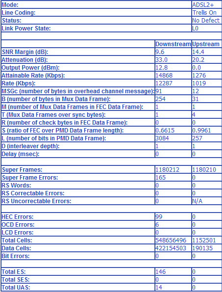 34783-SUPPORT > ЛС 293675 Добрый день, Большое спасибо интернет починили, мастера/инженеры Роман и Александр мега-молодцы, все быстро и очень качественно. Спасибо еще раз!!! Все работает. Вот параметры. SNR Margin (dB):--------13.3 24.5 Attainable Rate (Kbps):-17240 1144 Rate (Kbps):------------10239 507 Суппорт, еще одна маленькая просьба, подкрутите параметры на линии, входящую до 13-мбит, а исходящую до 1-мбита, чтобы было вообще перфекто, я ребят забыл попросить. Большое Вам и Им Спасибо!!! | | |||