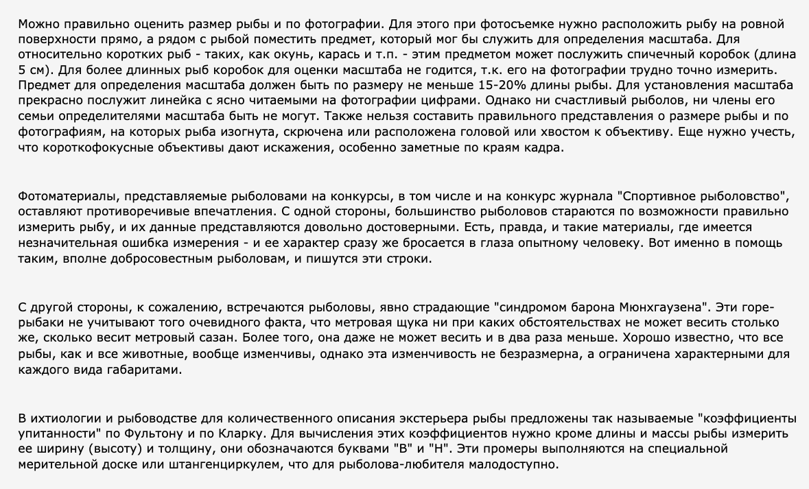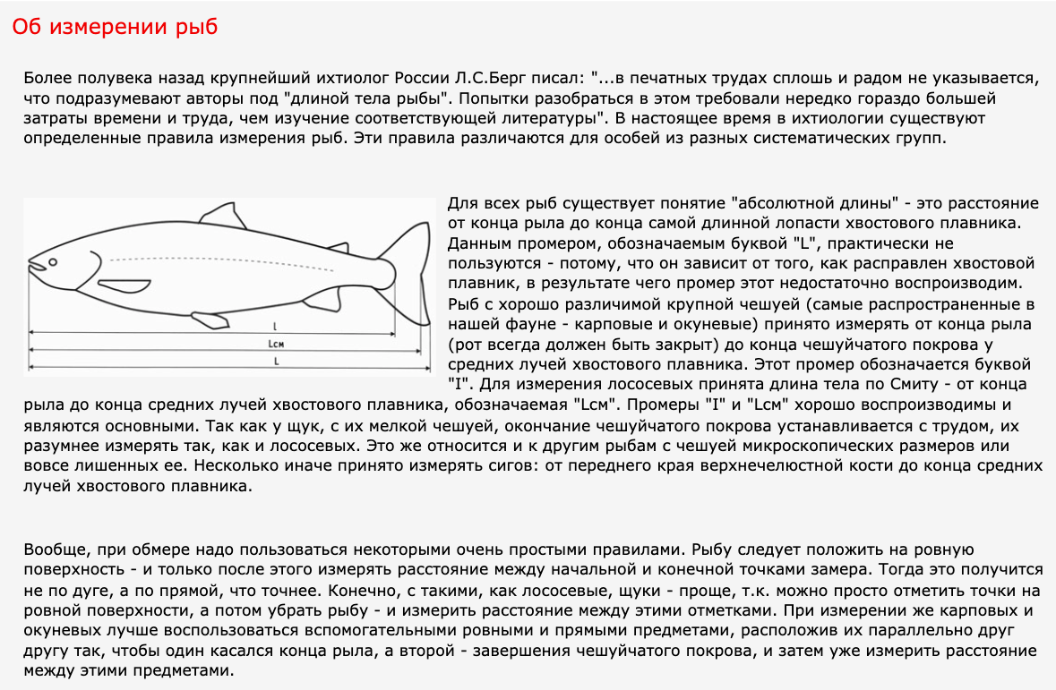 Попалась интересная статья о подходах к измерению рыб. Прочитал с большим интересом. В любом деле свои нюансы. ![]() ![]() ![]() Викторовский Р. Об измерении рыб. Спортивное рыболовство №7 июль 2007. | |