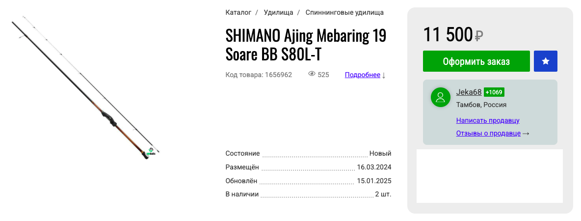 И к бабке не ходи, это уже другой спиннинг, а не любимая Tiro. Если будешь подыскивать замену, посмотри на Shimano Ajing Mebaring 19 Soare BB S80L-T. Приятный очень спиннинг. Вершинка тубулярная, а не солидовая. Купил себе в конце октября прошлого года для джига. Длина универсальная - берег/лодка. Сторговался за 10 тыс. плюс бесплатная доставка. Оригинальный новый продукт со всеми шимановскими фантиками. Чехла в комплекте нет. Покупал у этого торговца https://bidbaits.ru/bids/1656962.![]() | |
