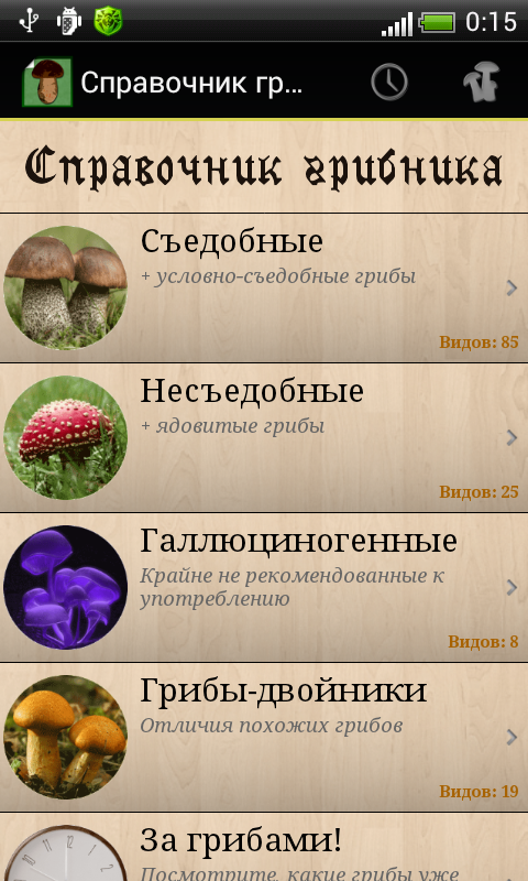 Еще одна программа для грибников имеющих телефон или планшет с ОС Android Грибы. Советник В приложении 431 гриб, поиск по названию, фильтр по внешним признакам, ссылки на похожие грибы. В приложении более 1700 изображений, по три фото на каждый гриб. Скачать приложение можно в Google Play: https://play.google.com/store/apps/d...mushroom_guide | |