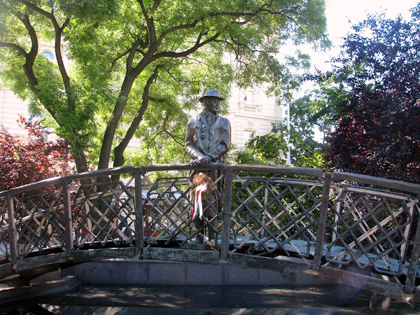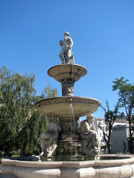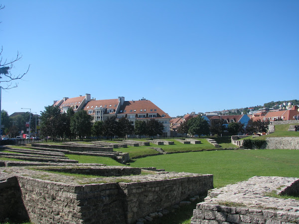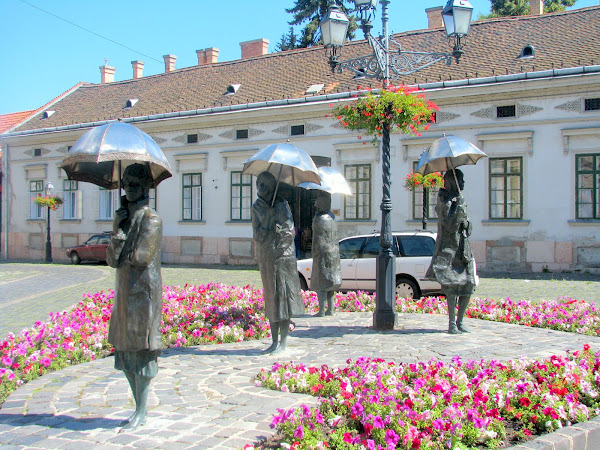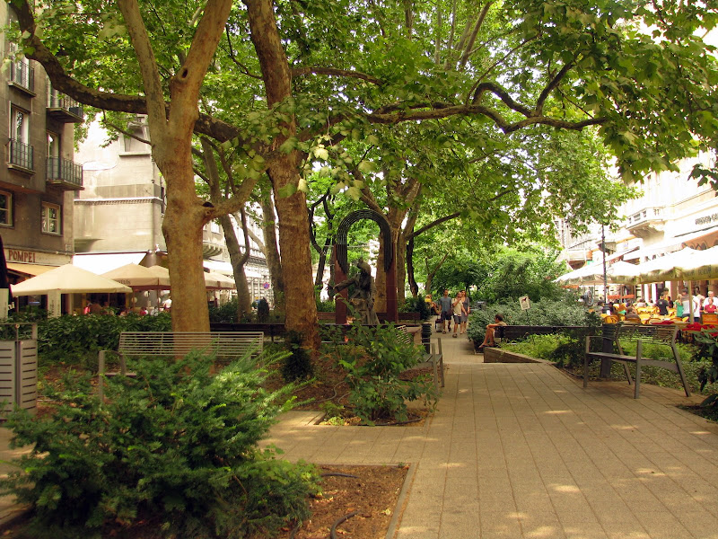 На будайской стороне города есть развалины римского амфитеатра Это площадь Флориана: Дальше на север - площадь Сентелек с чем-то похожим на традиционный европейский чумной столб. и рядом совсем маленькая площадь Фё с "гуляющими под дождем" | | |