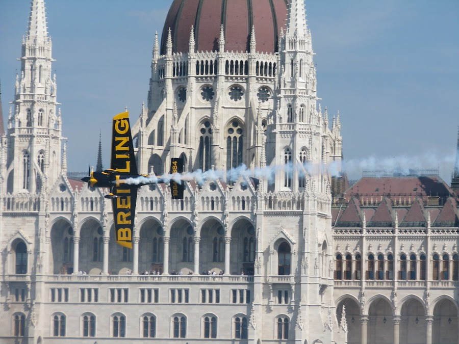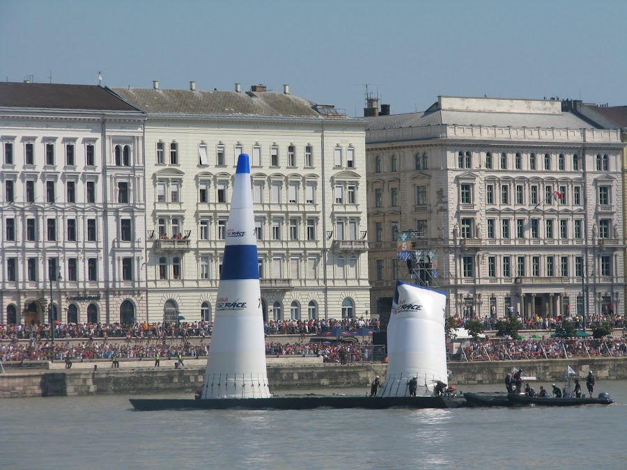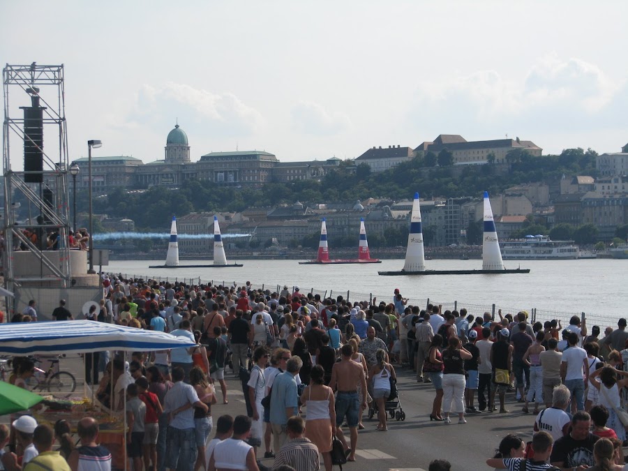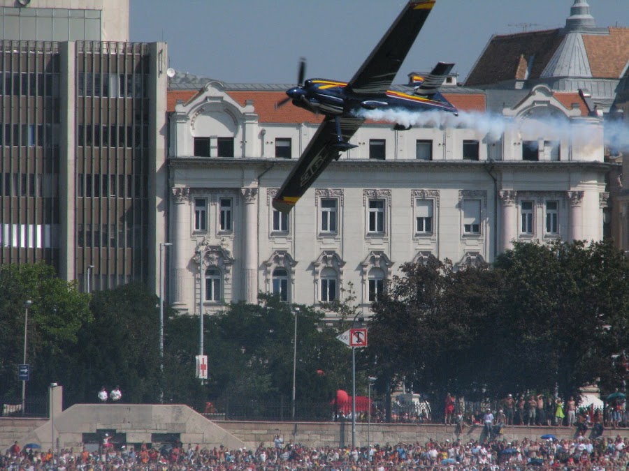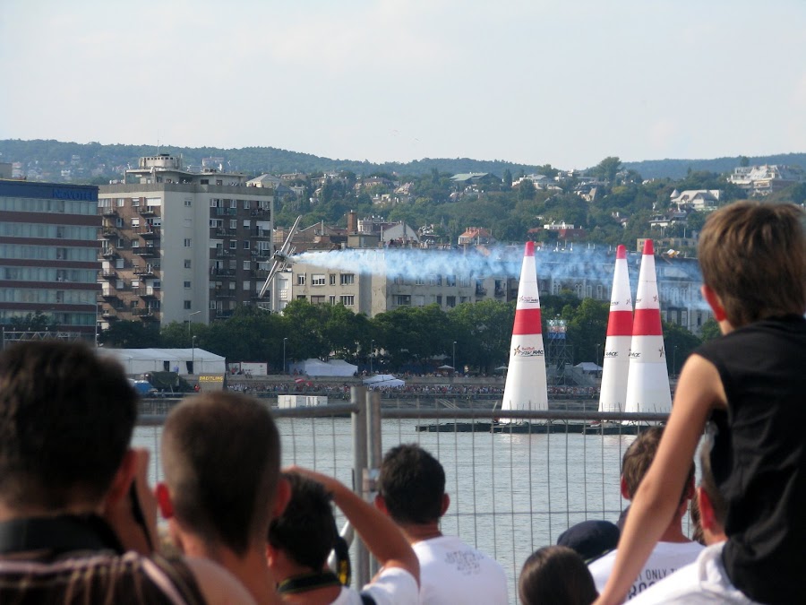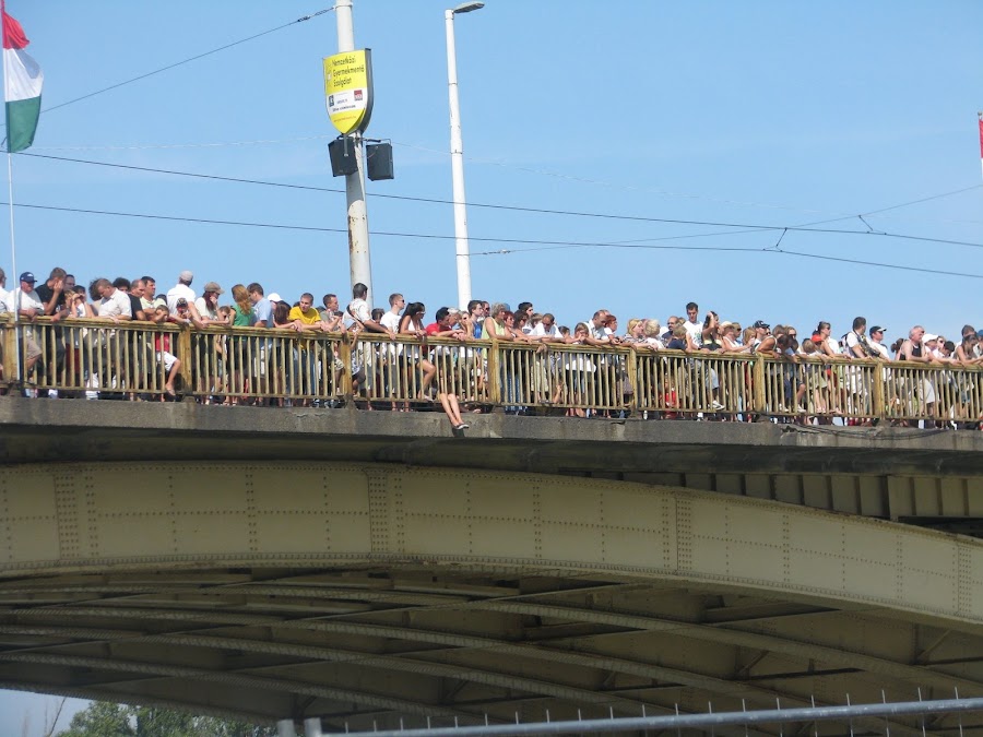 Горизонт завален, а самолётик нет: Зрители на Маргит Хид: День был очень жарким: С пештской стороны. Самолёт кажется таким маленьким, что решительно отказываешься верить в полноразмерного взрослого дядьку внутри: | | ||