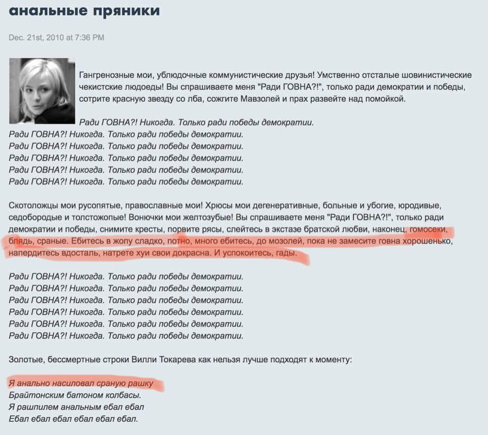 142-Цап царап >143-Цап царап >144-Цап царап > ну што?! што?!!! што Вы хотите этими репостами мыслей нового министра нового путйнского правительства сказать?! Вы знаете кто? Вы - провокатор!!! Вы провоцируете лично меня сказать: "Это идеально! Это гармонично!!! Это симфония!!!!" Ну ведь это идеально и гармонично: что отец нацыи, забывший много десятилетий назад, как живут простые люди, боящийся участвовать в любых реальных политических мероприятиях (от теледебатов до нецензурируемых пресс-конференций, прямых линий и встреч с реальными людьми) назначает скрывающего свои реальные доходы и имущество налоговика премьер-министром правительства, где есть осуждённый судом за разбазаривание имущества спортакадемии министр спорта, где есть православная министр культуры, преисполненная примитивных представлений о мире, находящих выход в обсценной вербализации, ненавидящая музеи, признающаяся в лжи !!! Идеально! Слава России! Думаю, что следующее путйнское правительство, куда позовут новым министром культуры уже светочку "более лучше" курицину элегантно оттенит нынешнее )) Если в последние издыхательные телодвижения СССР на высокие должности назначали лиц типа малоповоротливых робковатых рафиков нишановых, то теперь время изменилось и вверх виносится что-то вроде рогозиных и матершинных абрамченок )) | | |