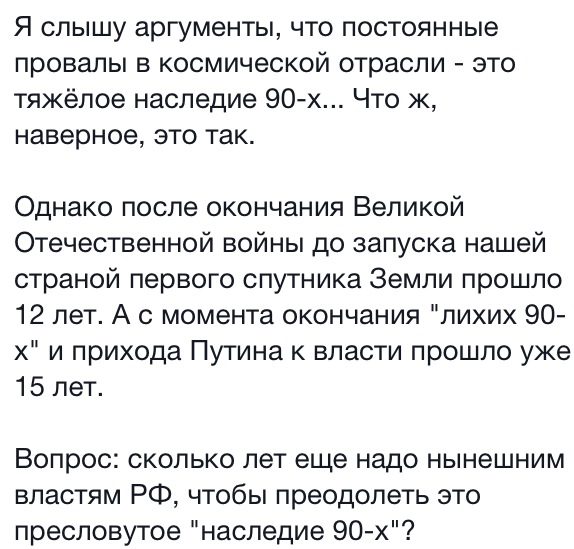 | Нештатная ситуация с Протонами была создана тогда, когда руководить Роскосмосом взялись журналист, библиотечный коллектор, счетовод и прочие юристы | | ||